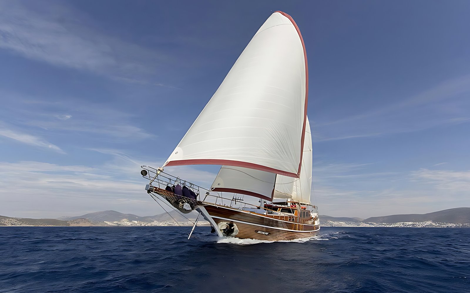 Yatımız mavi yolculuğunuz süresince hergün hava şartlarına göre yelken ile seyirin keyfini misafirlerimize sunmaktadır.