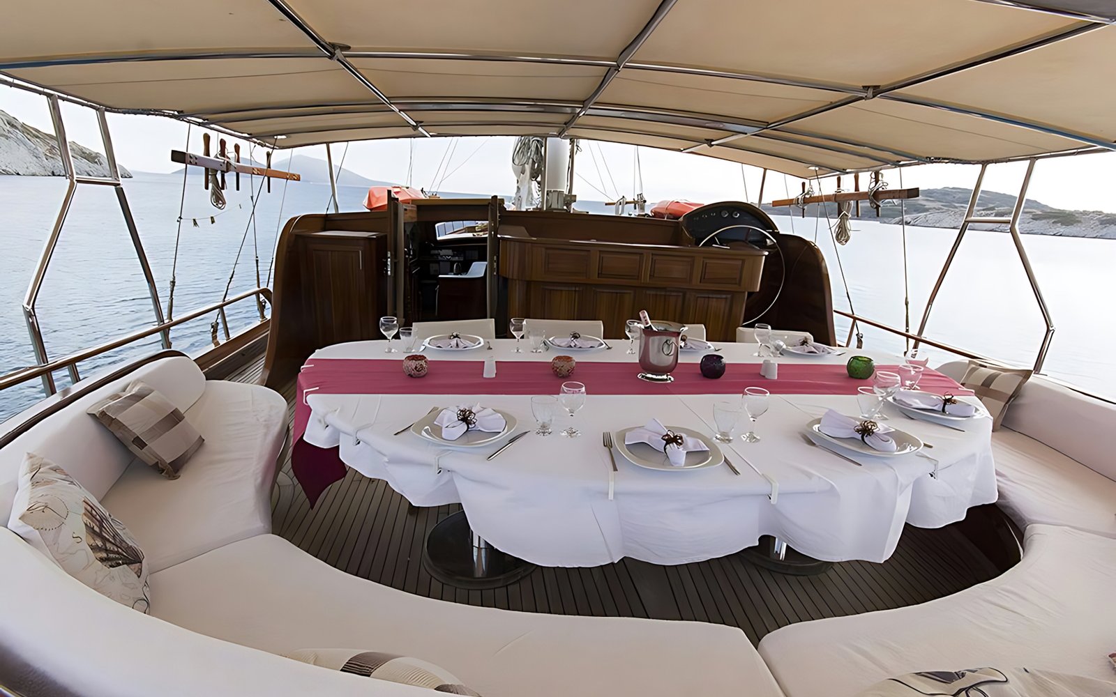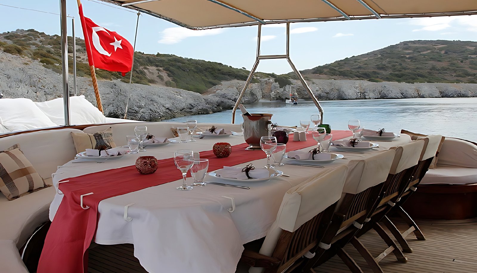 Seçenek 3 Siz hiç bir şeye karışmaz tatiliniz buyunca size tam pansiyon konaklama sunarız. Bu durumda Standart, Lüks ya da Delüks menülerimizden birini tercih ederek kişi başı günlük 35 ile 55 Euro arasında değişen bir bedel ödeyerek alkollü içecekler hariç herşey dahil tatilinizi yapabilirsiniz. Alkollü içeceklerinizi dilediğiniz şekilde temin edip tekneye getirebilirsiniz.
