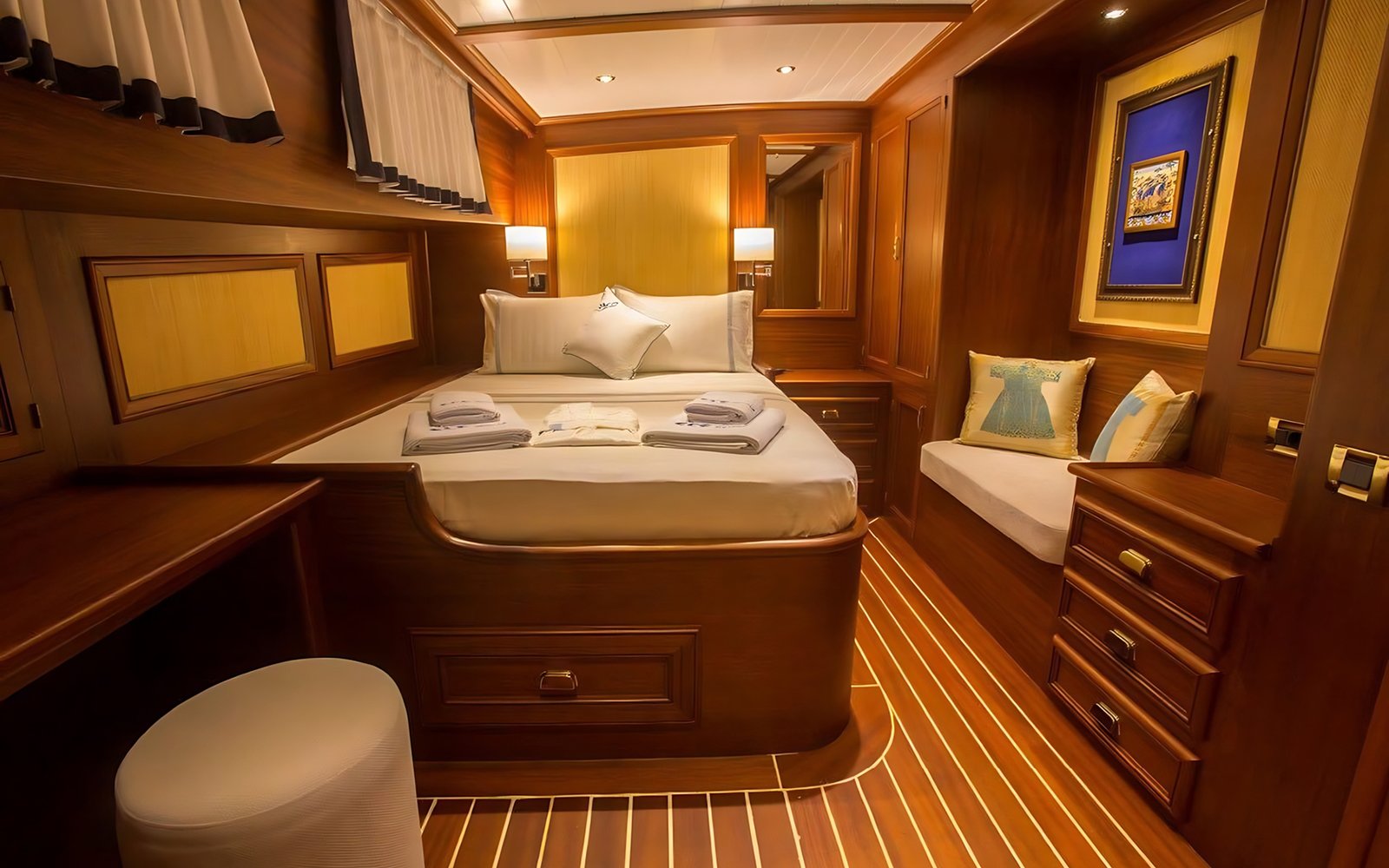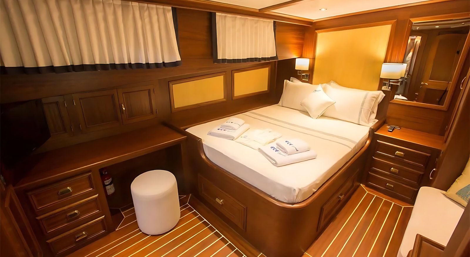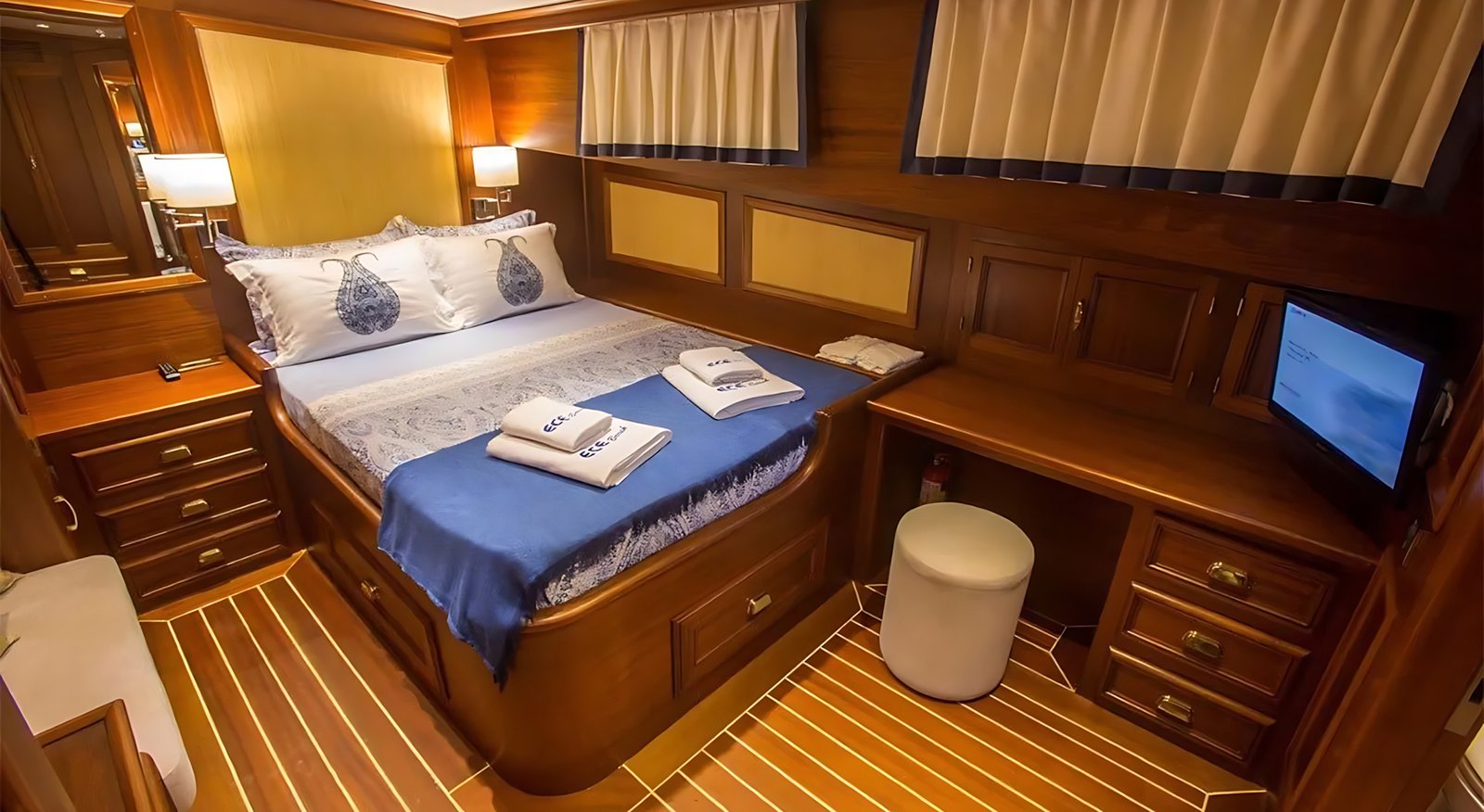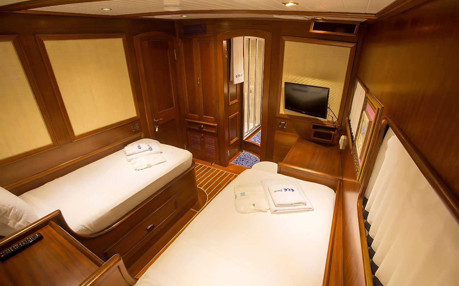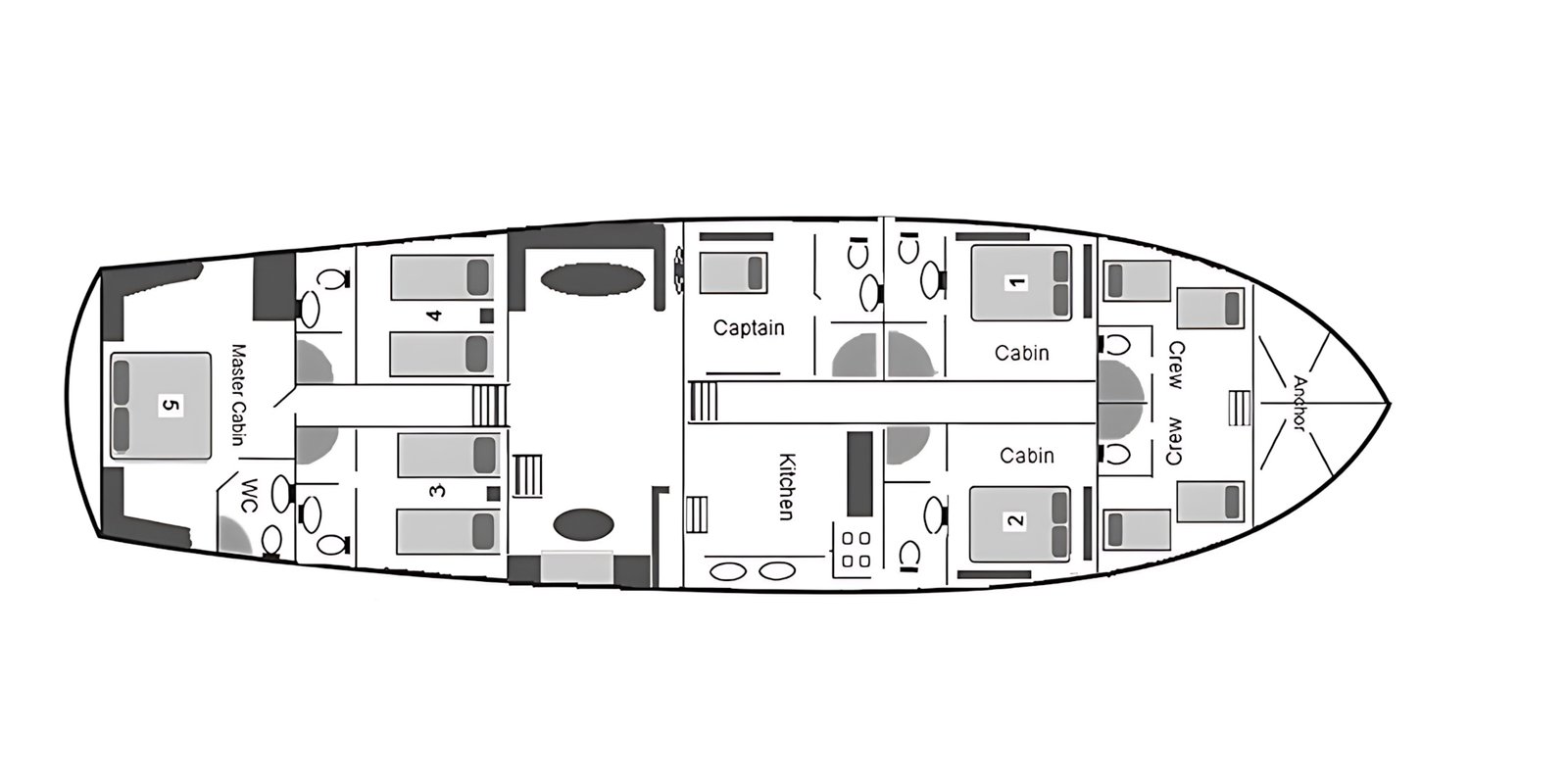 1 Master Kabin, 2 Double Kabin, 2 Twin Kabin olmak üzere birbirinden şık ve rahat, kendine ait duş, WC ve kliması olan yatımız 5 kamaraya sahiptir.