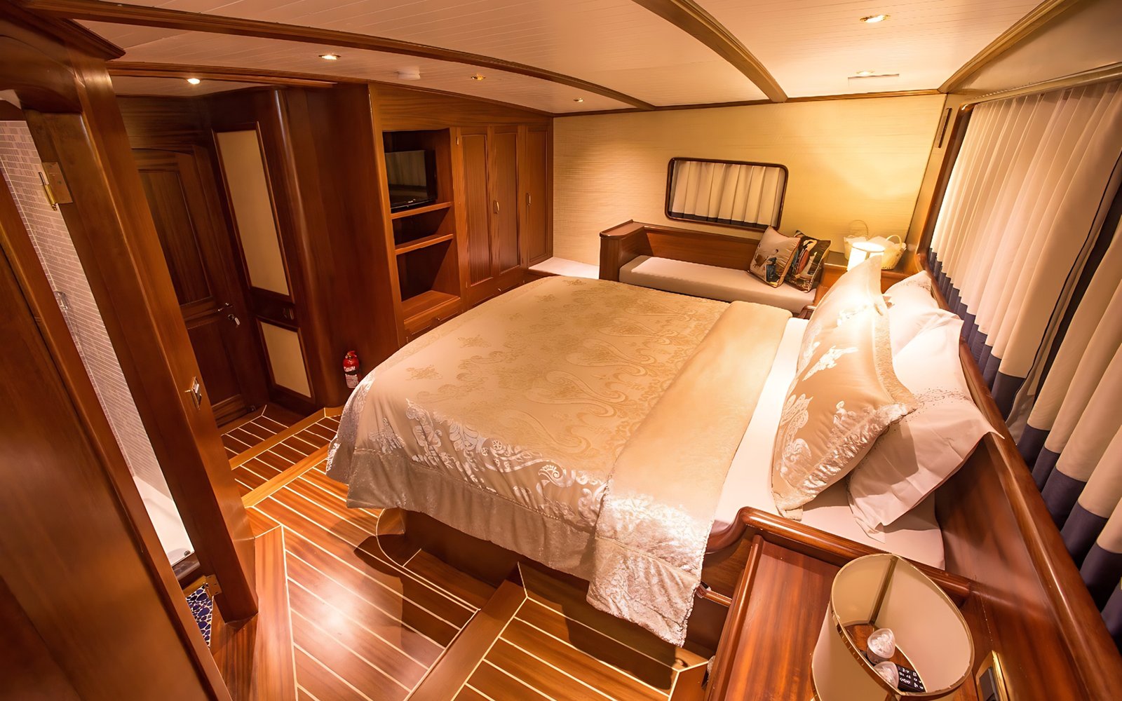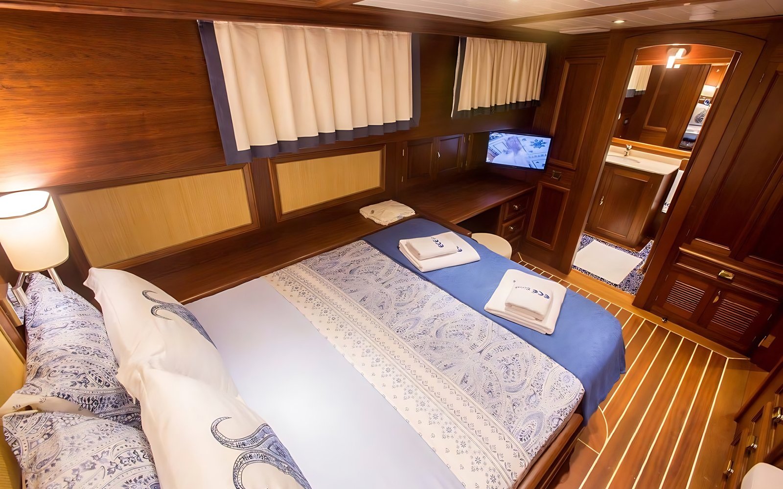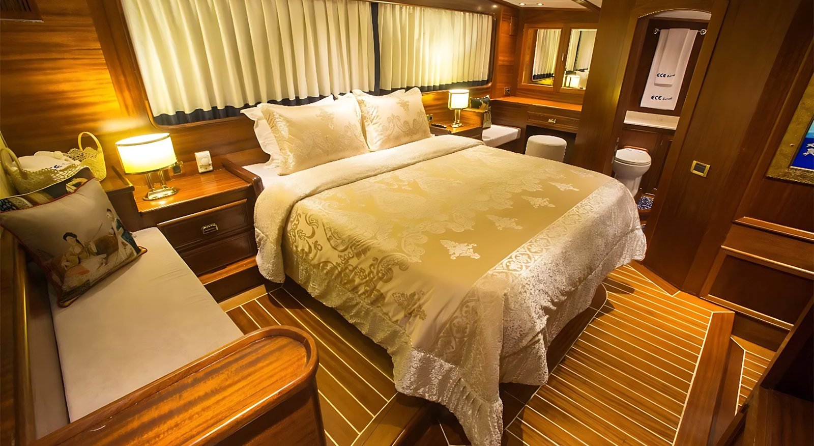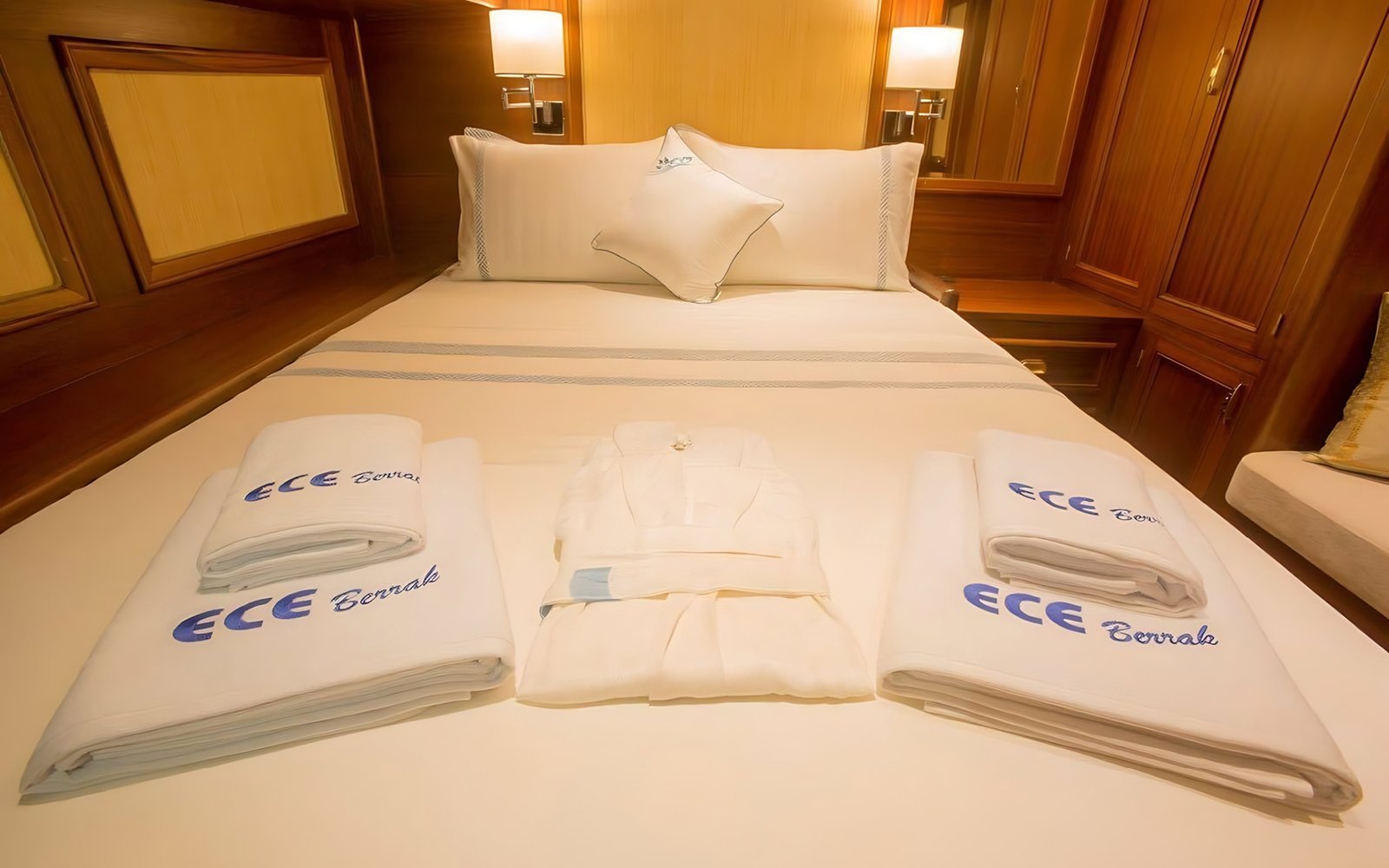 1 Master Kabin, 2 Double Kabin, 2 Twin Kabin olmak üzere birbirinden şık ve rahat, kendine ait duş, WC ve kliması olan yatımız 5 kamaraya sahiptir.