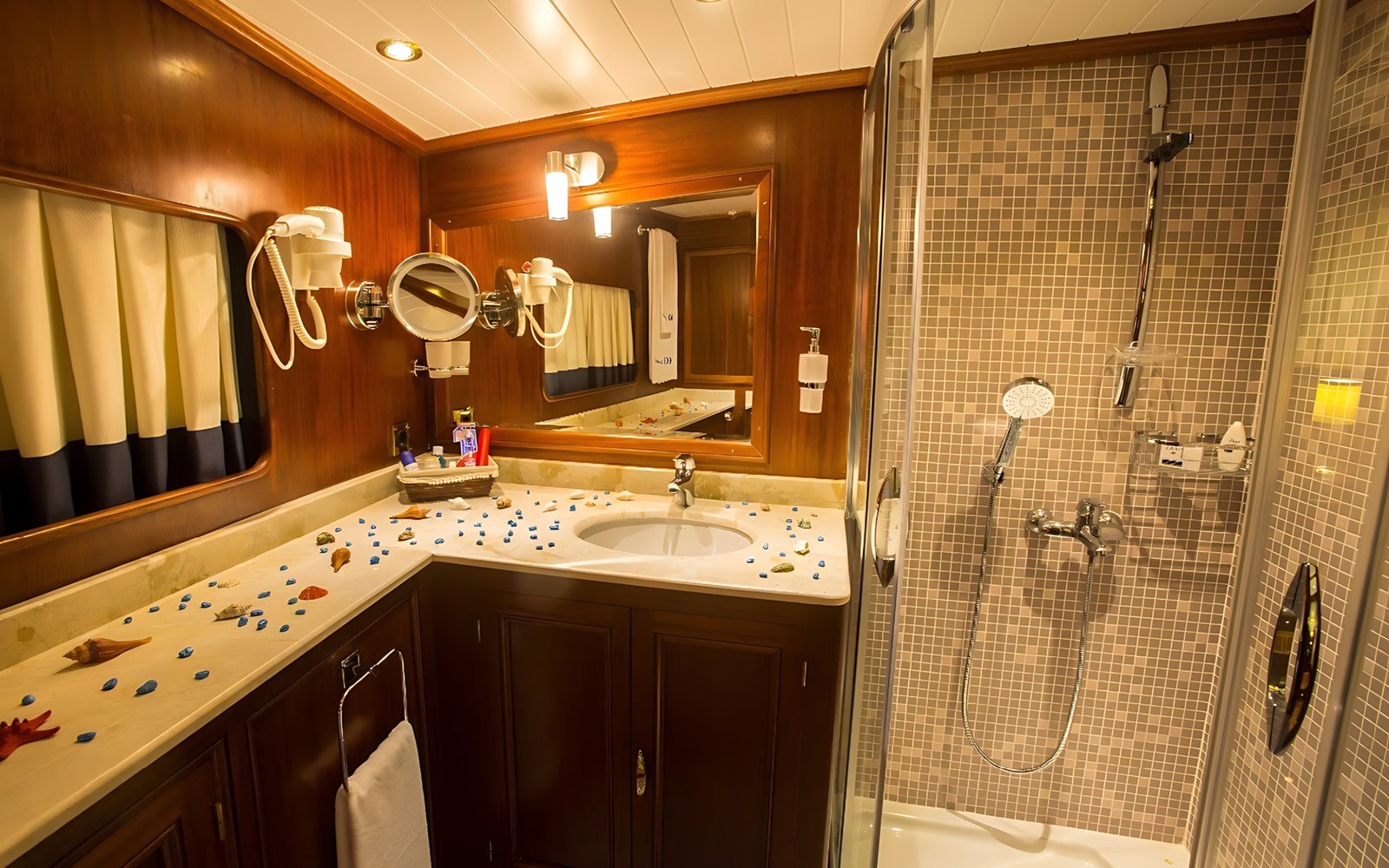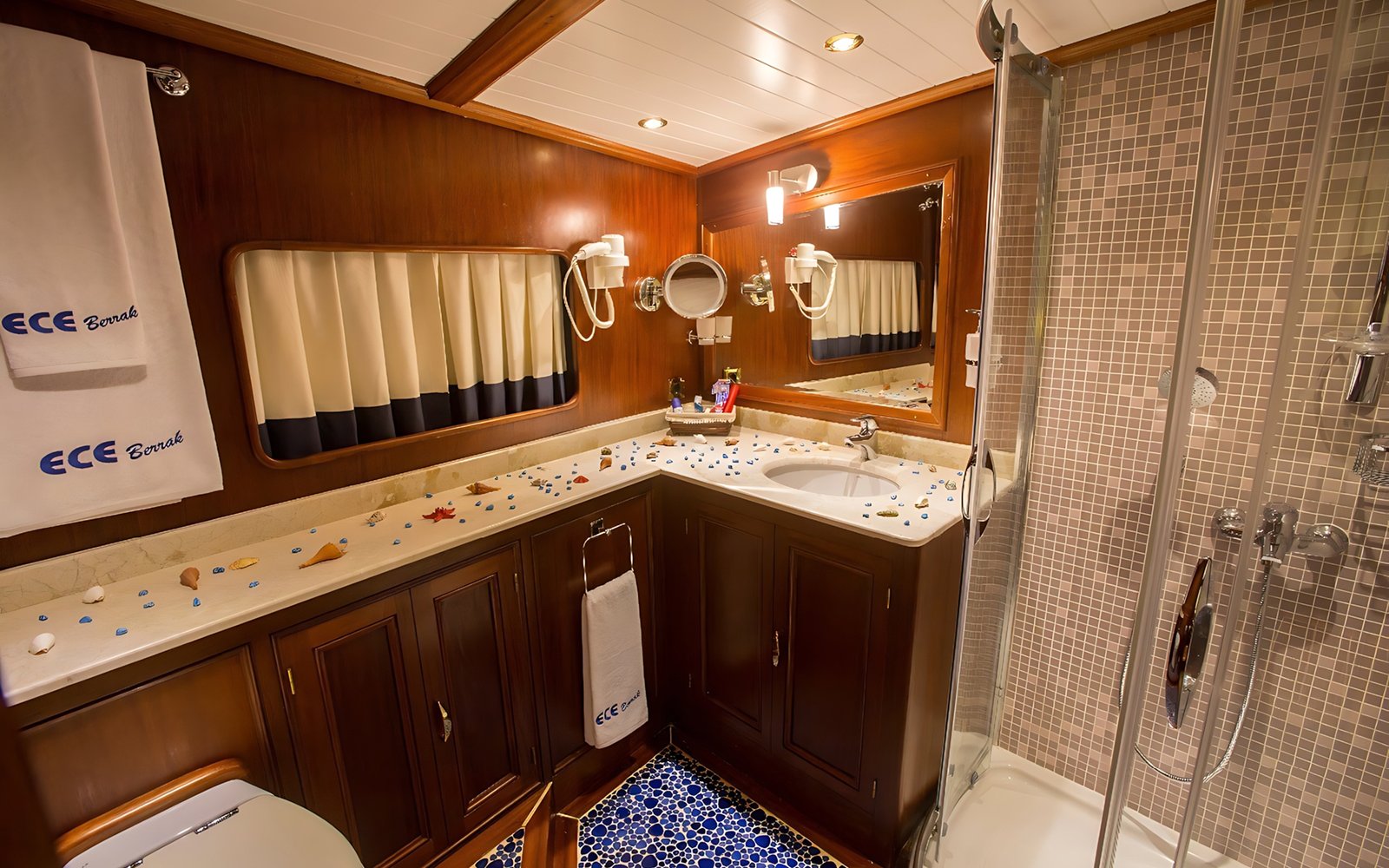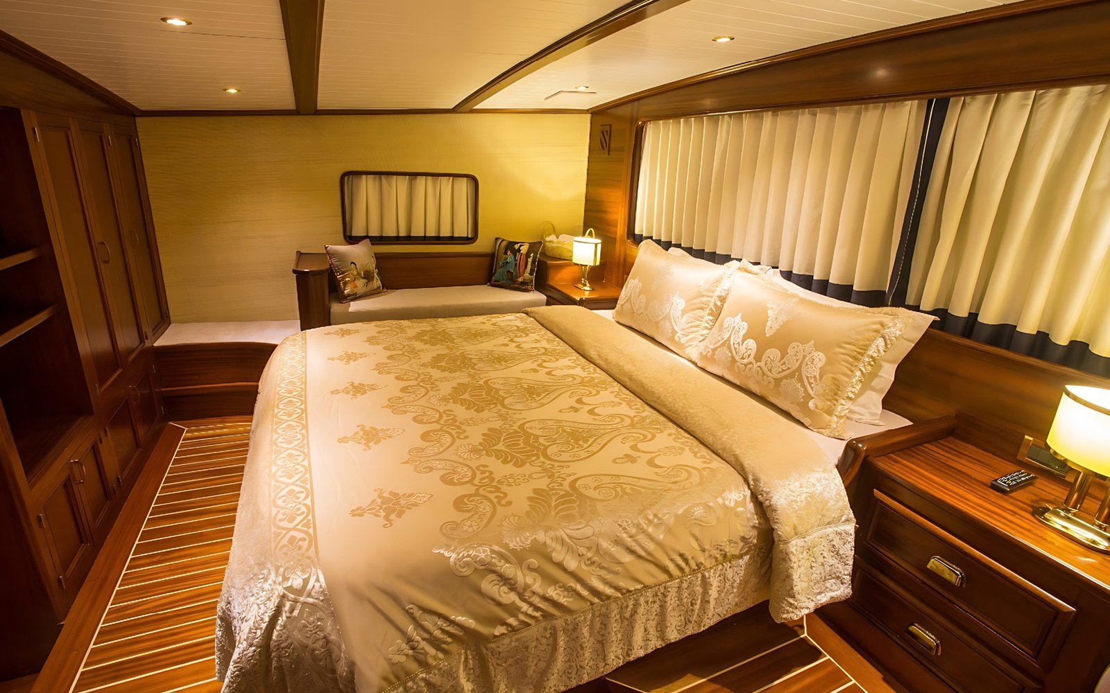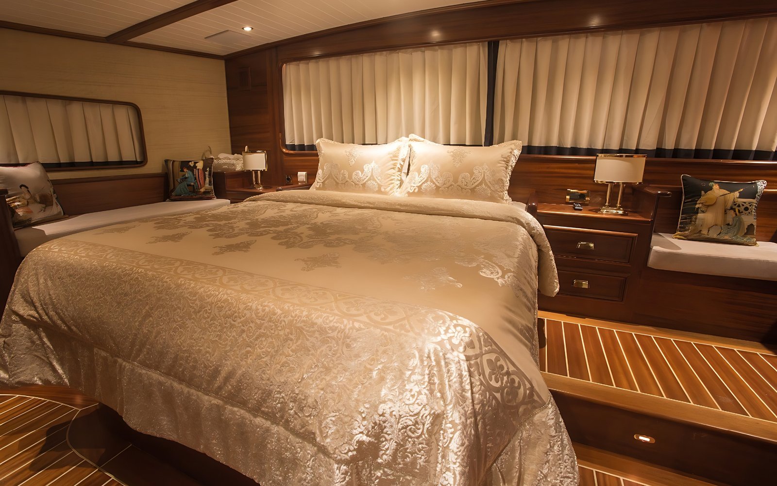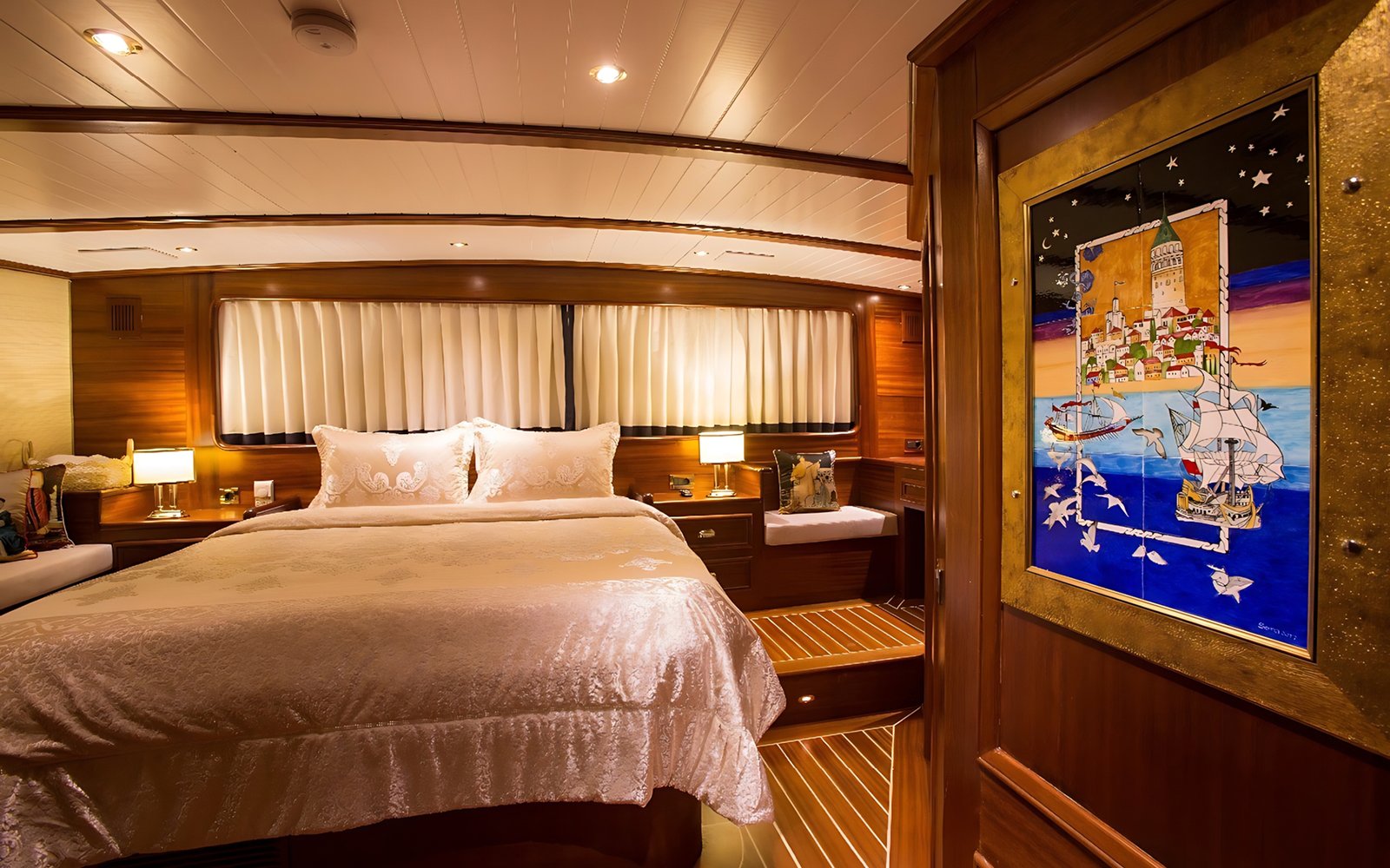 1 Master Kabin, 2 Double Kabin, 2 Twin Kabin olmak üzere birbirinden şık ve rahat, kendine ait duş, WC ve kliması olan yatımız 5 kamaraya sahiptir.