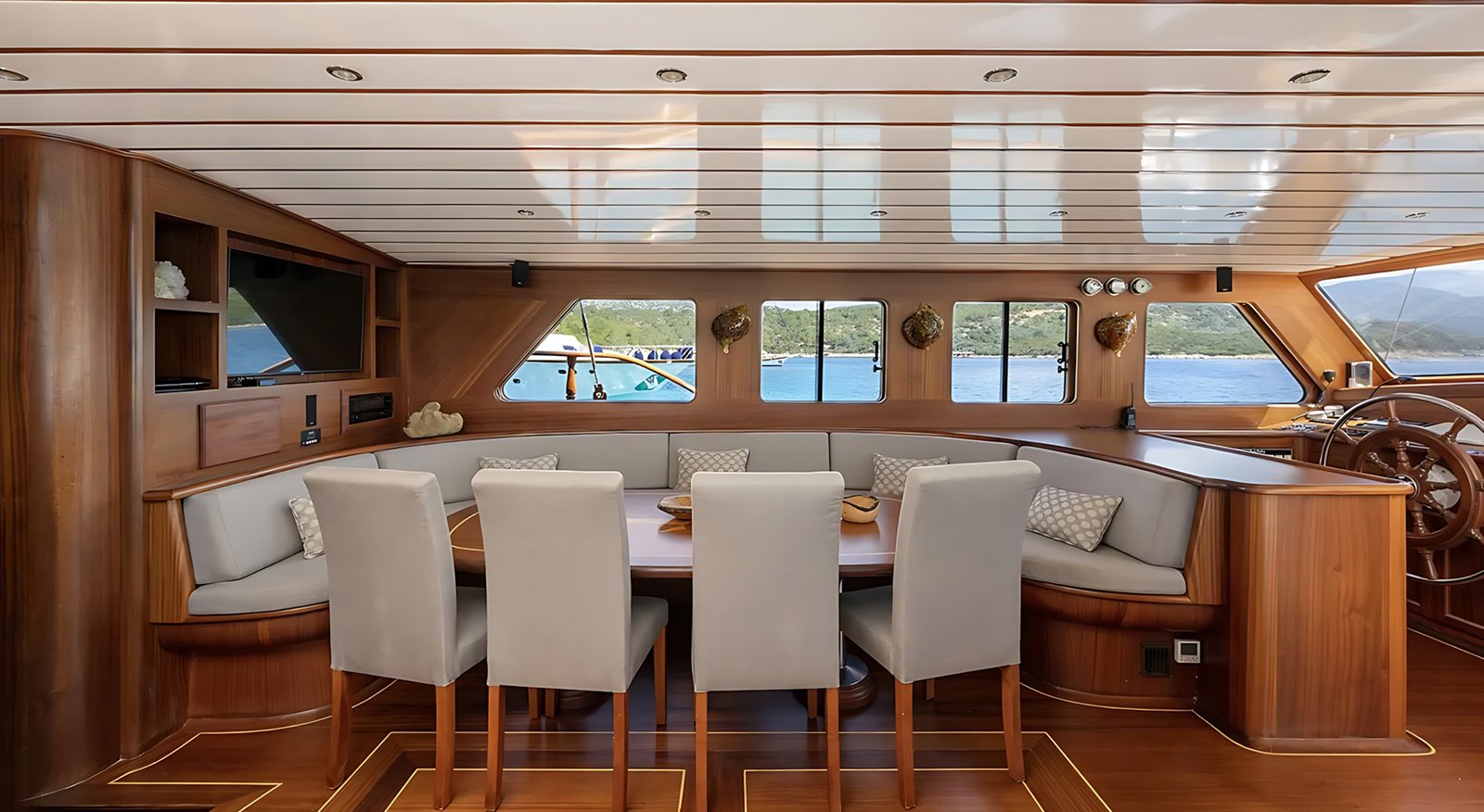 Seçenek 3 Siz hiç bir şeye karışmaz tatiliniz buyunca size tam pansiyon konaklama sunarız. Bu durumda Standart, Lüks ya da Delüks menülerimizden birini tercih ederek kişi başı günlük 35 ile 55 Euro arasında değişen bir bedel ödeyerek alkollü içecekler hariç herşey dahil tatilinizi yapabilirsiniz. Alkollü içeceklerinizi dilediğiniz şekilde temin edip tekneye getirebilirsiniz.