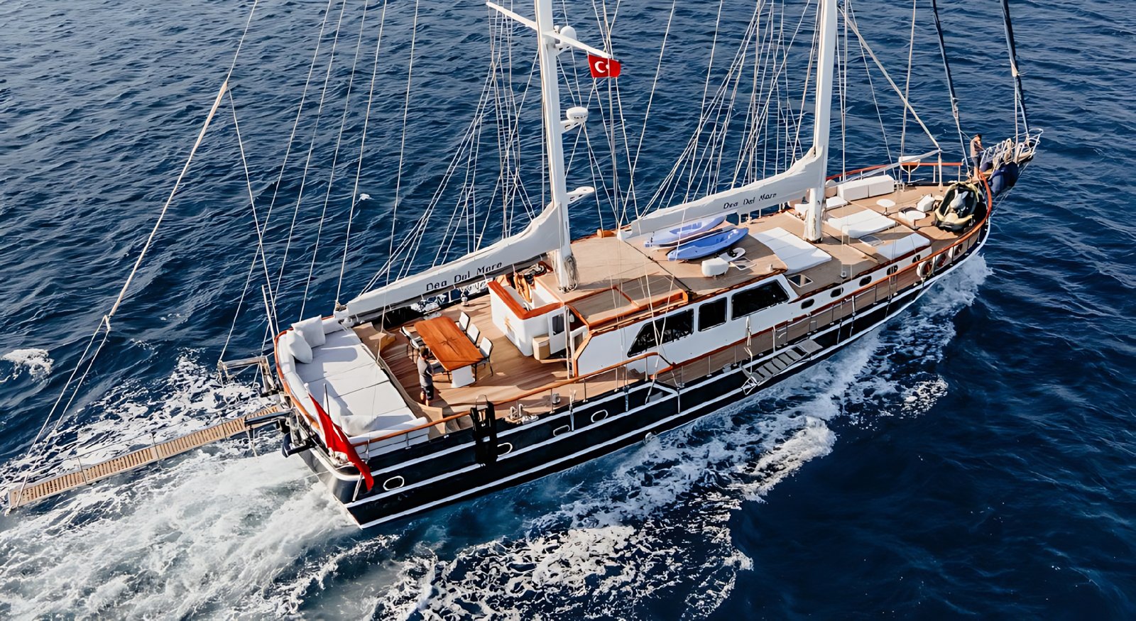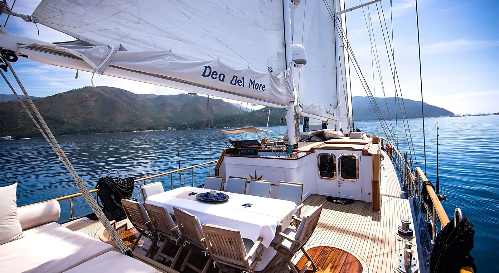 Gulet Dea Del Mare, 28 metre uzunluğunda, 2008 yılından itibaren mavi tur sektöründe hizmet vermektedir. Gulet Dea Del Mare 2012 senesinde yenileme çalışmasından sonra daha lüks ve modern dizayna kavuşmuştur. Teknemiz 2 master kabin, 2 double kabin ve 1 twin kabin olmak üzere toplam 10 misafirin konaklayabileceği Vip yattır. Her kabinde son derece konforlu ve size özel duş ve ev tipi wc imkanı sunmaktadır. Sıcak yaz günlerinde konforlu konaklama için kabinlerde ve salonda klima mevcuttur.