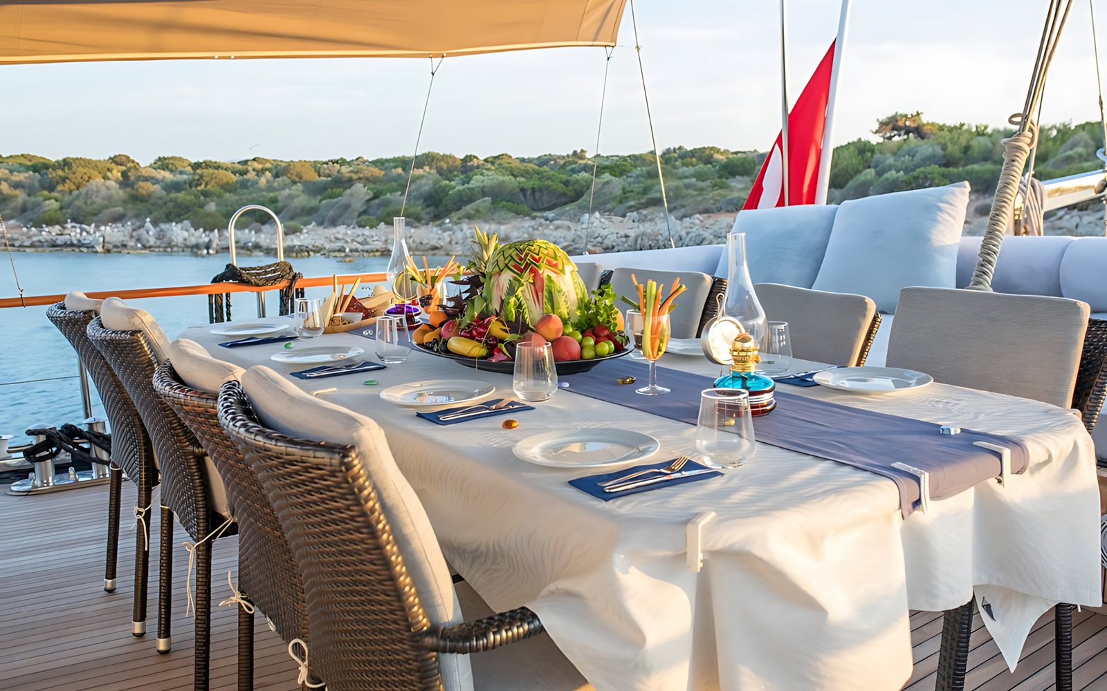 Seçenek 3 Siz hiç bir şeye karışmaz tatiliniz buyunca size tam pansiyon konaklama sunarız. Bu durumda Standart, Lüks ya da Delüks menülerimizden birini tercih ederek kişi başı günlük 35 ile 55 Euro arasında değişen bir bedel ödeyerek alkollü içecekler hariç herşey dahil tatilinizi yapabilirsiniz. Alkollü içeceklerinizi dilediğiniz şekilde temin edip tekneye getirebilirsiniz.