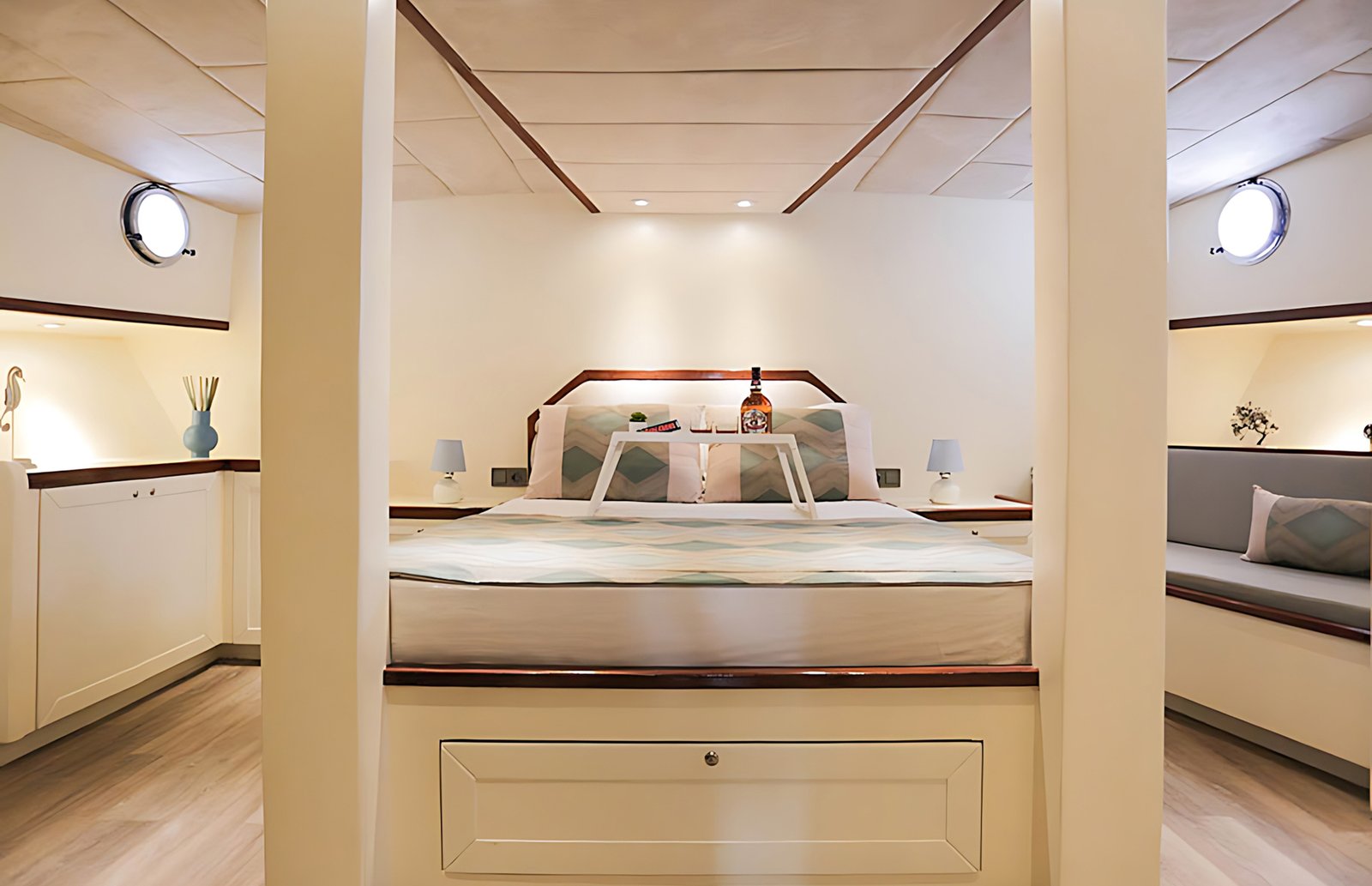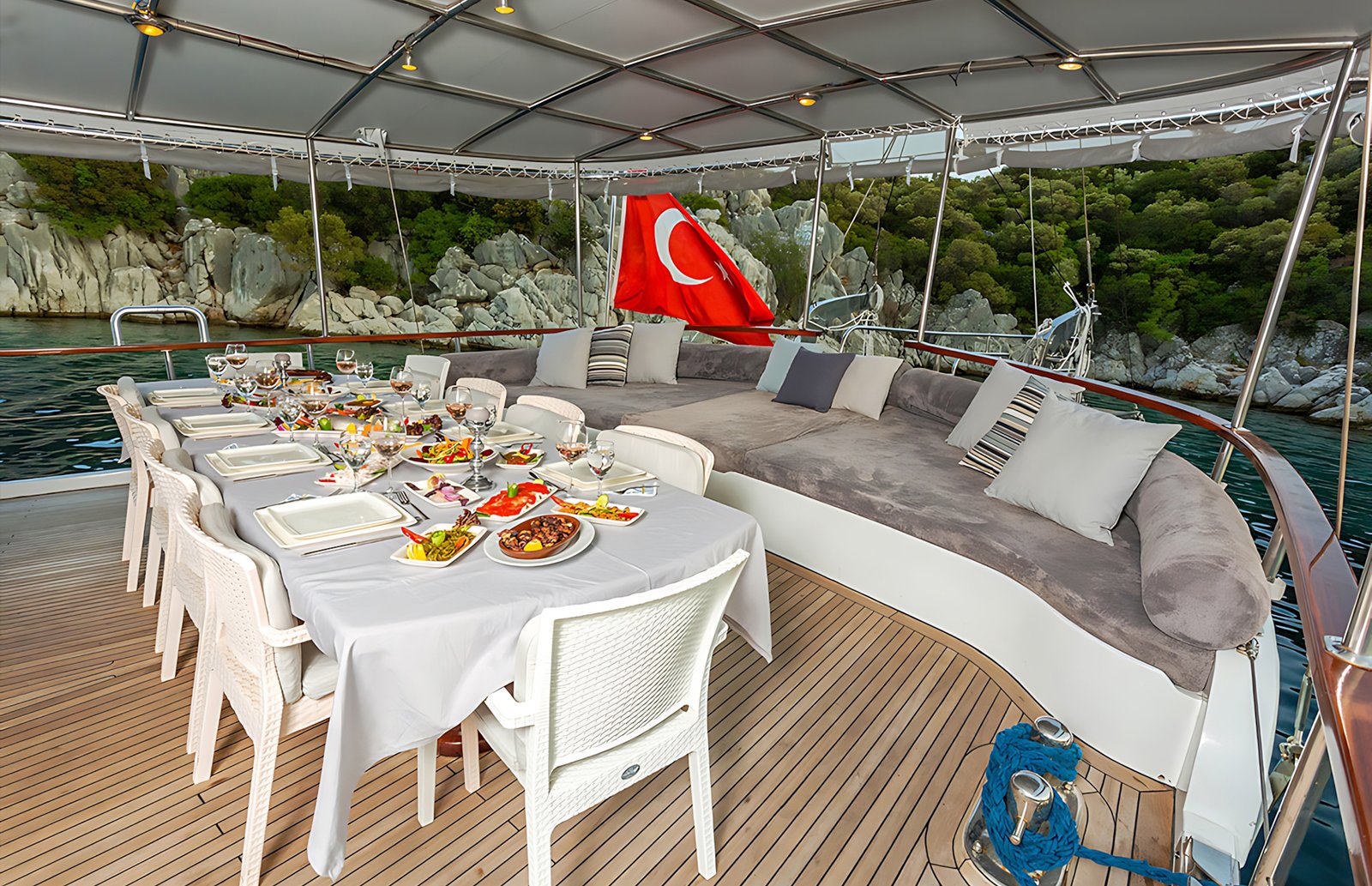 Seçenek 3 Siz hiç bir şeye karışmaz tatiliniz buyunca size tam pansiyon konaklama sunarız. Bu durumda Standart, Lüks ya da Delüks menülerimizden birini tercih ederek kişi başı günlük 35 ile 55 Euro arasında değişen bir bedel ödeyerek alkollü içecekler hariç herşey dahil tatilinizi yapabilirsiniz. Alkollü içeceklerinizi dilediğiniz şekilde temin edip tekneye getirebilirsiniz.
