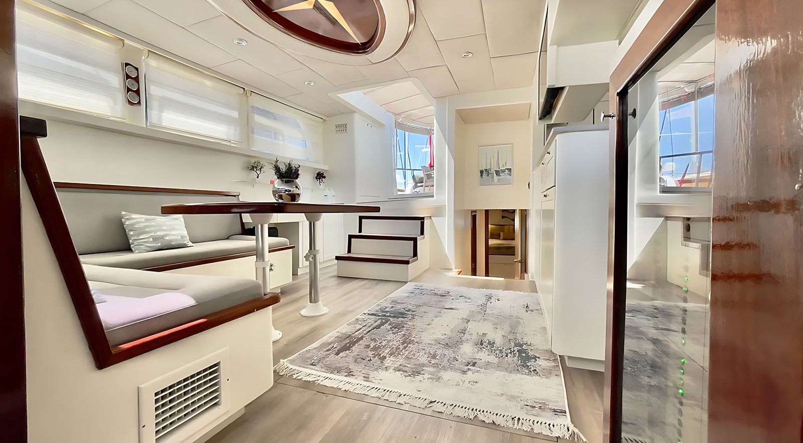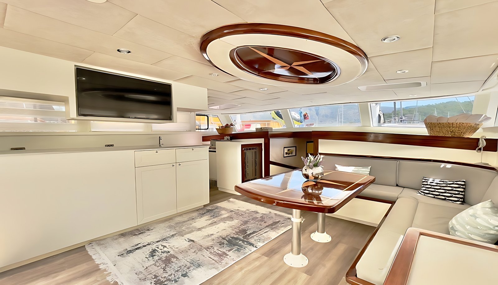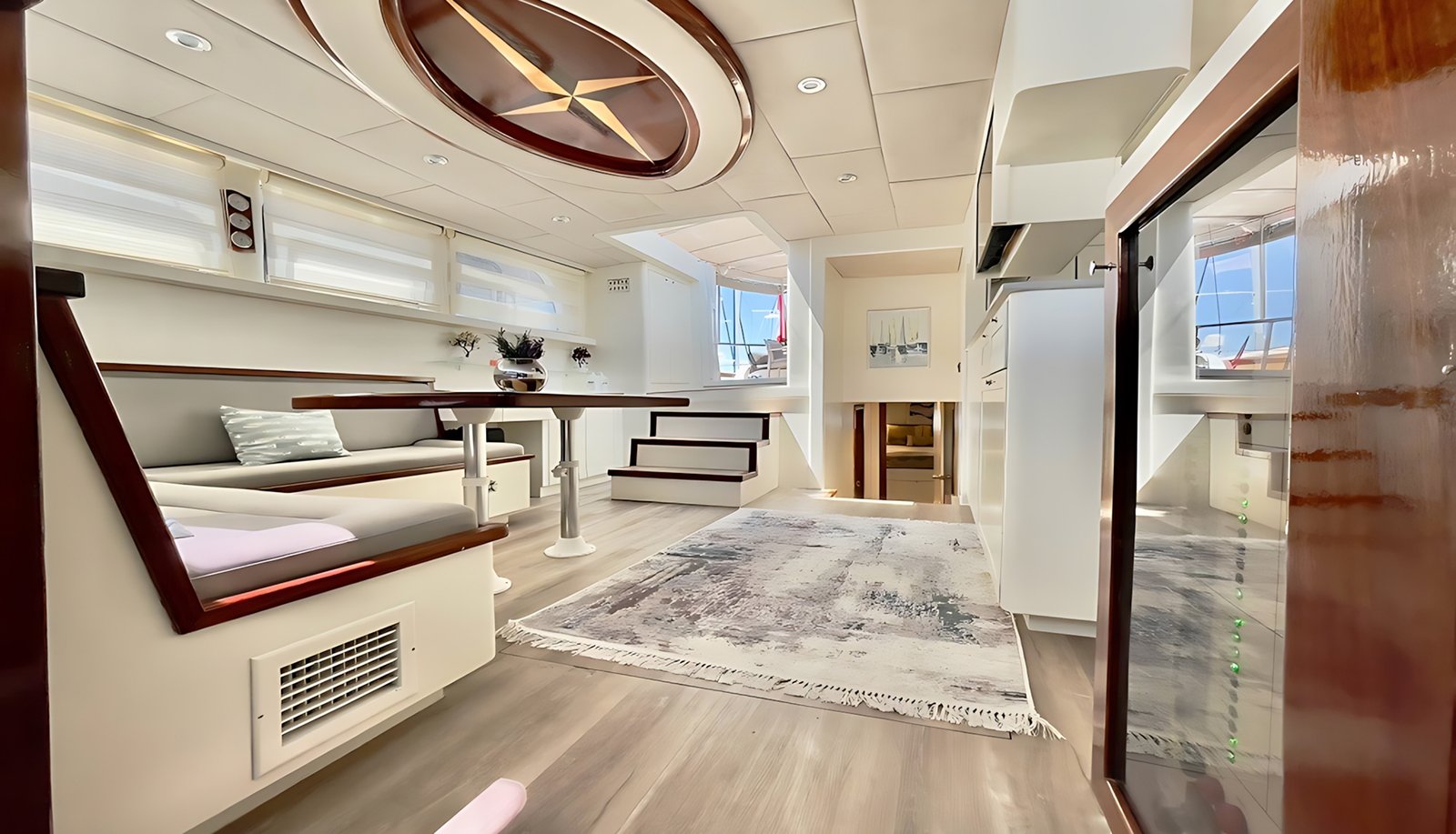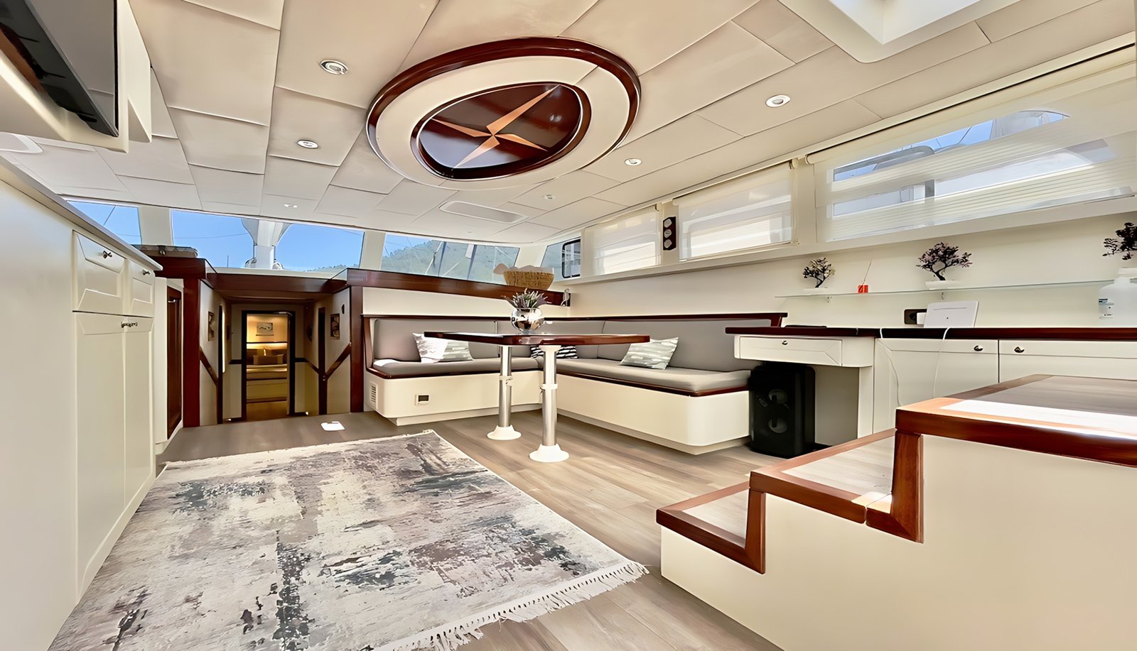 Kıç güvertede geniş minderli bir oturma alanı, yemek masası ve yemek alanı bulunmaktadır. Salonda ise ayrı bir yemek masası olup yemekleriniz tam donanımlı ayrı bir mutfakta hazırlanmaktadır. Gulet Derya Deniz tüm misafirleri için yeterli güneşlenme minderlerine ve alana sahip olarak düzenlenmiştir. Salonda ve tüm kabinlerde TV,DVD, müzik sistemi bulunmaktadır.