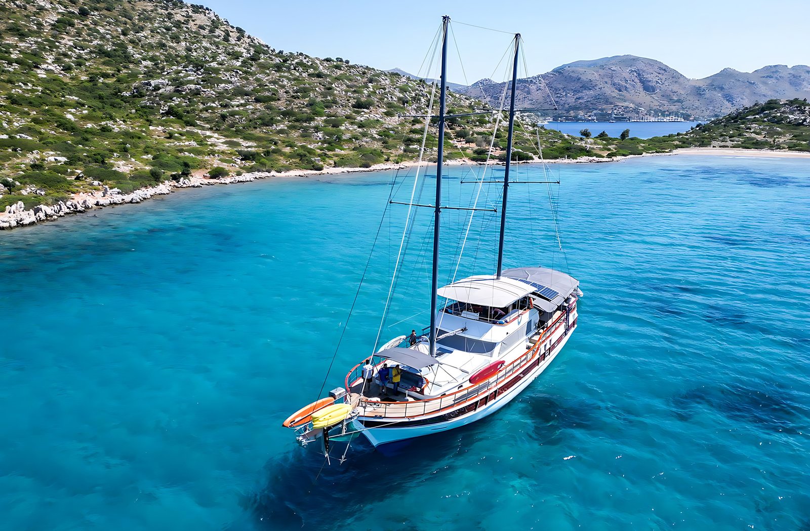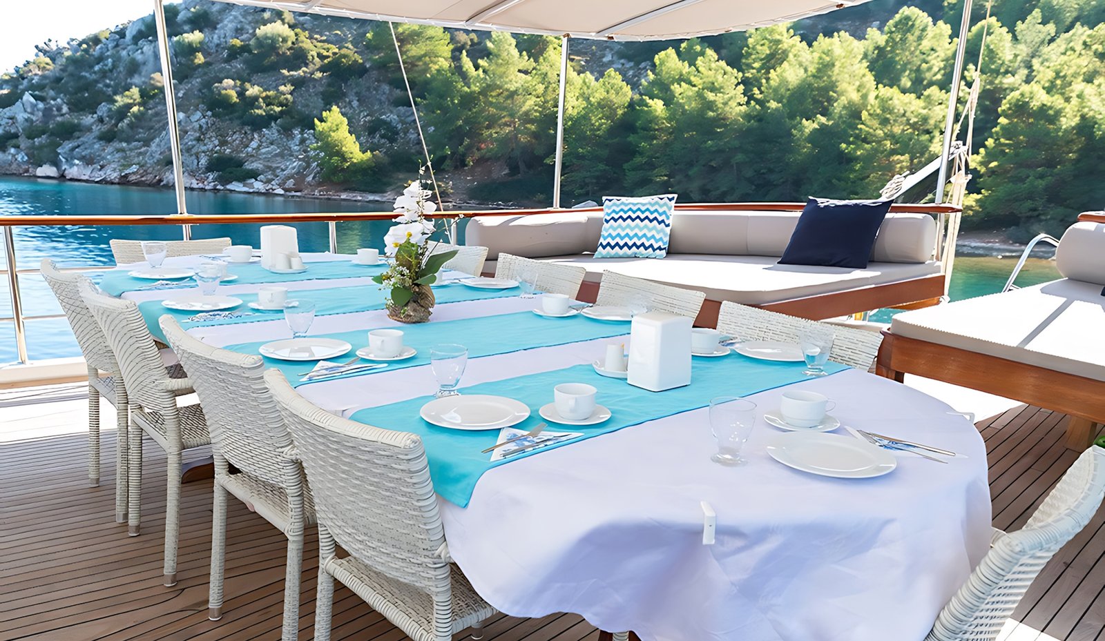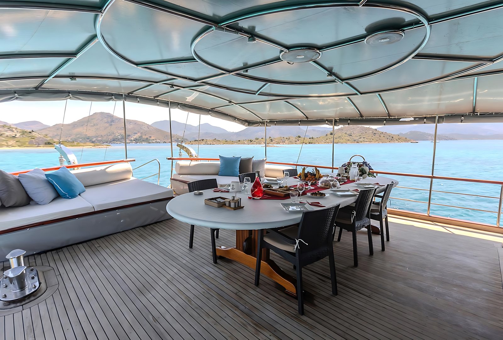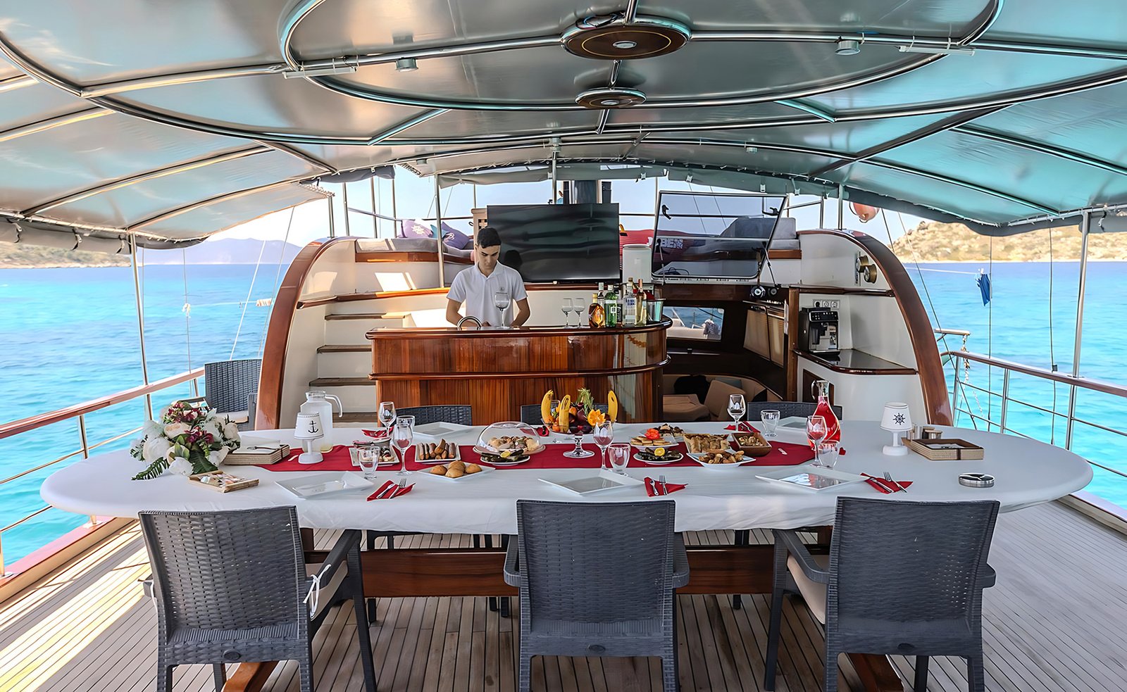 Seçenek 3 Siz hiç bir şeye karışmaz tatiliniz buyunca size tam pansiyon konaklama sunarız. Bu durumda Standart, Lüks ya da Delüks menülerimizden birini tercih ederek kişi başı günlük 35 ile 55 Euro arasında değişen bir bedel ödeyerek alkollü içecekler hariç herşey dahil tatilinizi yapabilirsiniz. Alkollü içeceklerinizi dilediğiniz şekilde temin edip tekneye getirebilirsiniz.