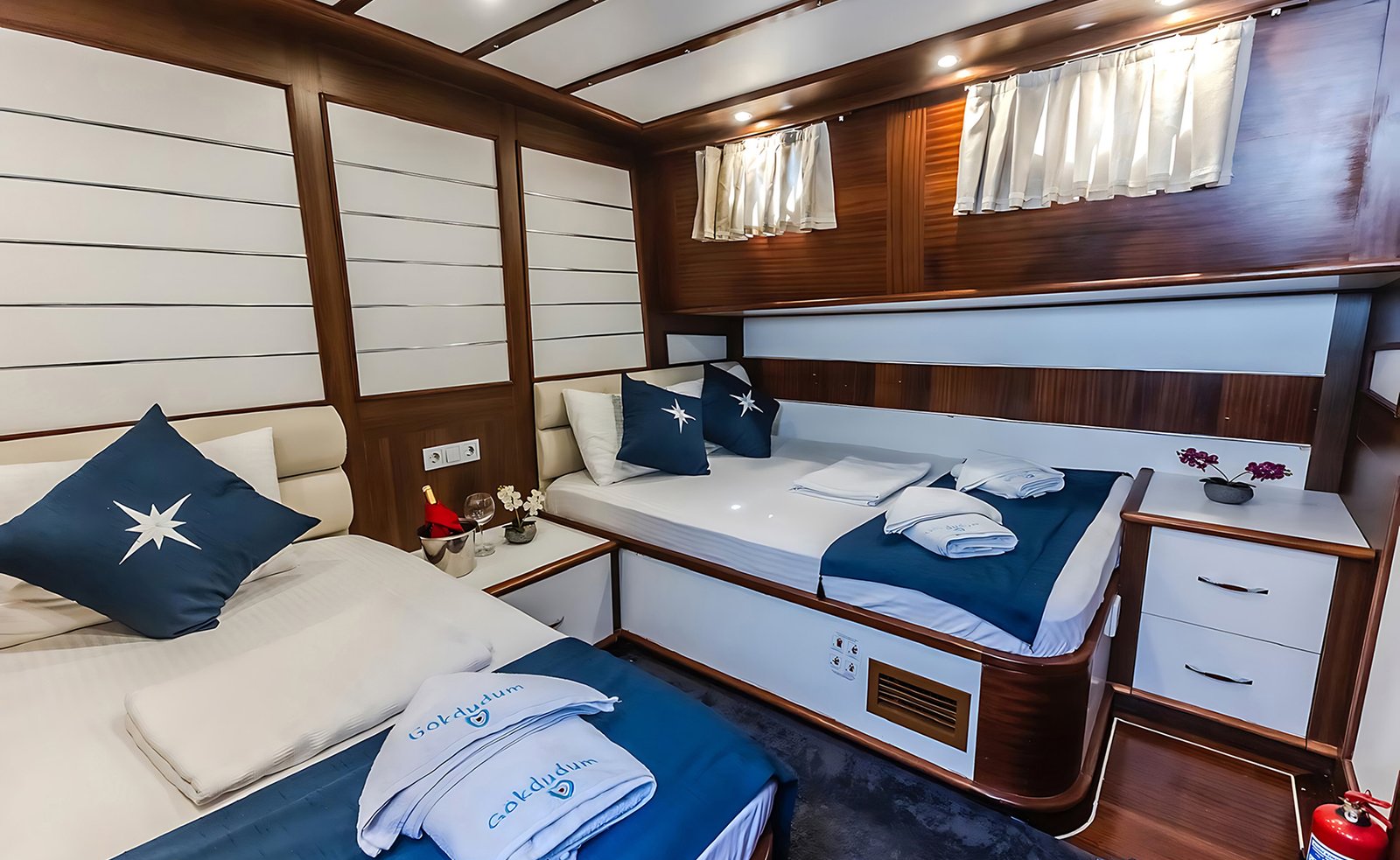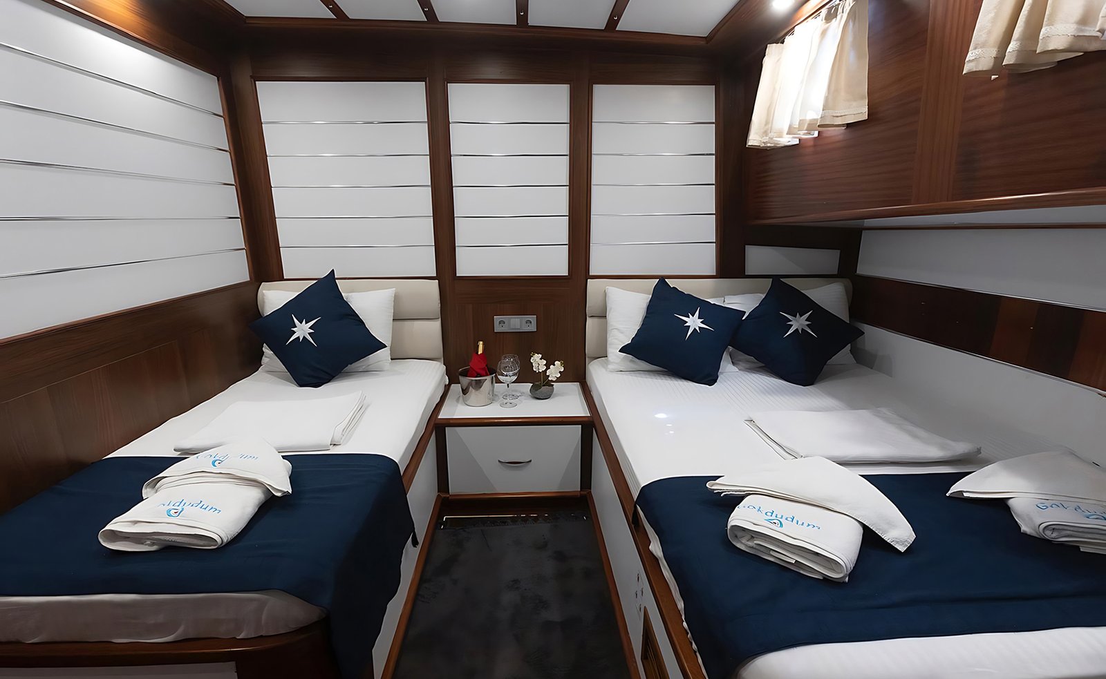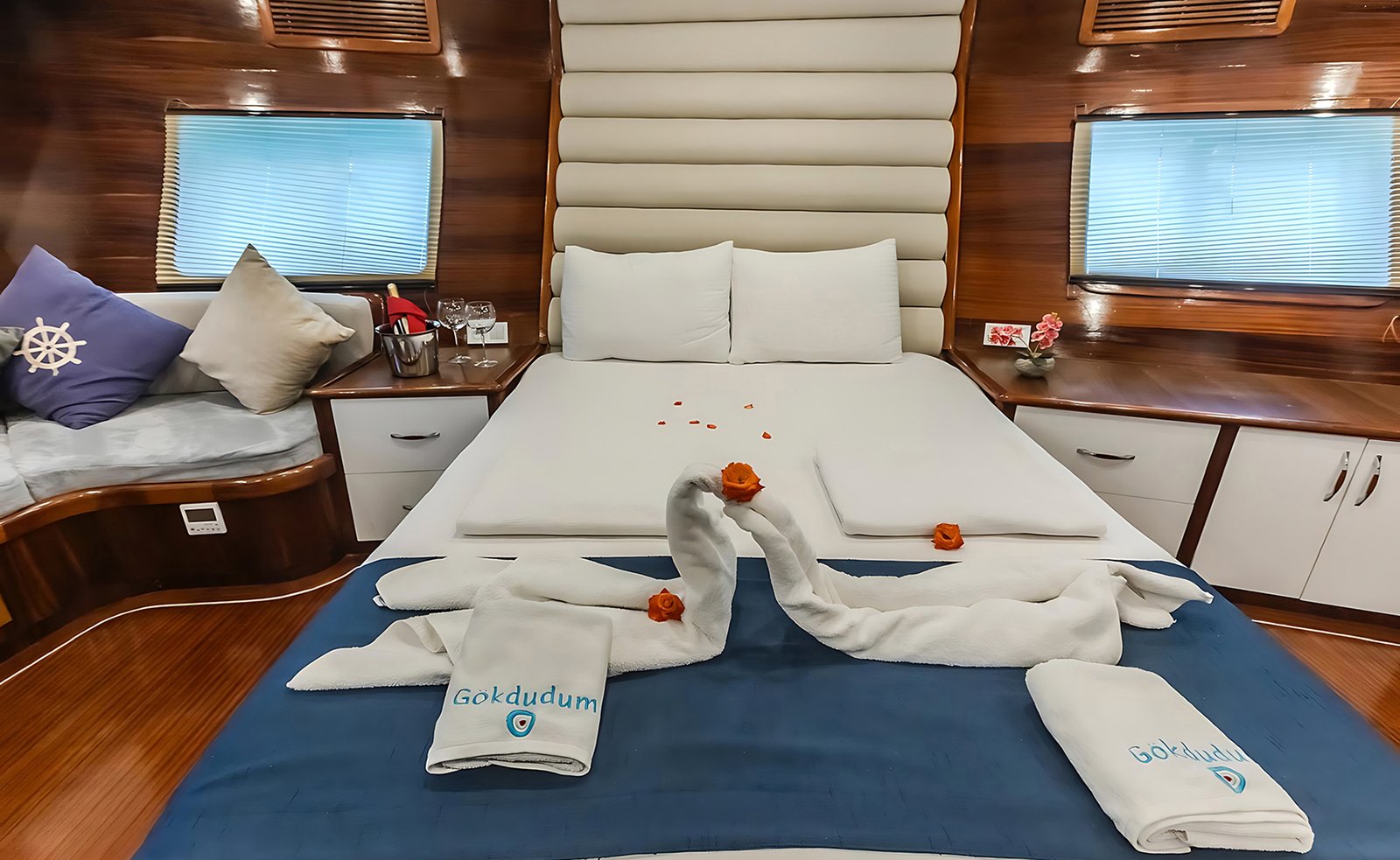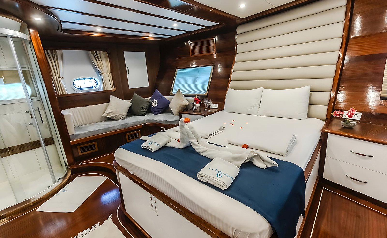 Gök Dudum Gulet 2022 yılı yapımı 26 m 5 kamara 11 misafir kapasiteli Guletimiz 2 adet büyük master kamaralı 2 adet double kamara ve 1 kamara üç kişilik bir double ve yanında tek kişilik yatak mevcut olan guletmiz son derece modern bir tasarım ve ayrıca su sporu opsiyonu mevcut.