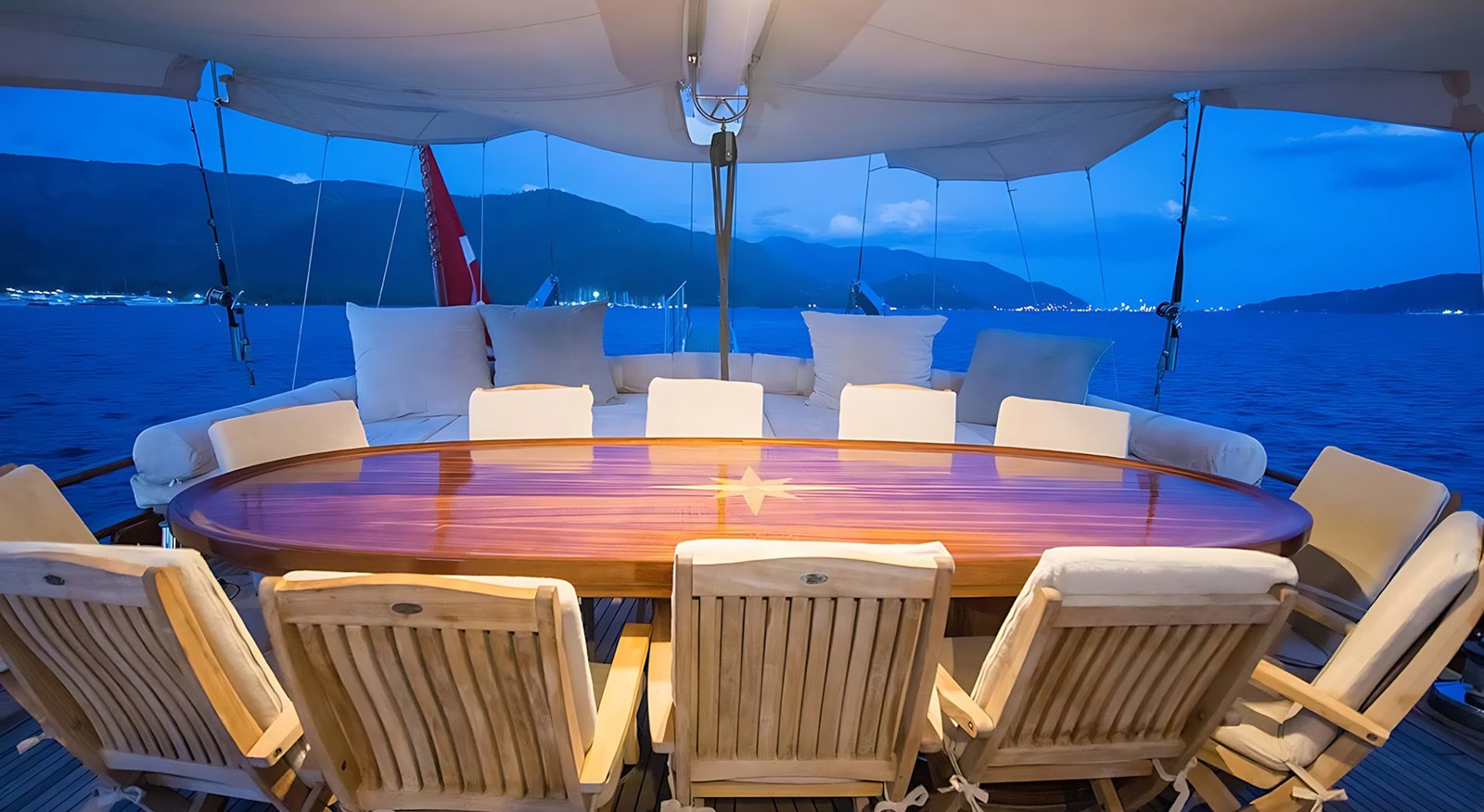 Seçenek 3 Siz hiç bir şeye karışmaz tatiliniz buyunca size tam pansiyon konaklama sunarız. Bu durumda Standart, Lüks ya da Delüks menülerimizden birini tercih ederek kişi başı günlük 35 ile 55 Euro arasında değişen bir bedel ödeyerek alkollü içecekler hariç herşey dahil tatilinizi yapabilirsiniz. Alkollü içeceklerinizi dilediğiniz şekilde temin edip tekneye getirebilirsiniz.