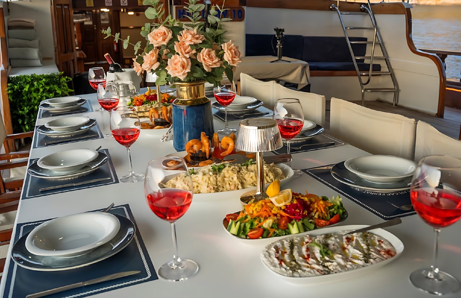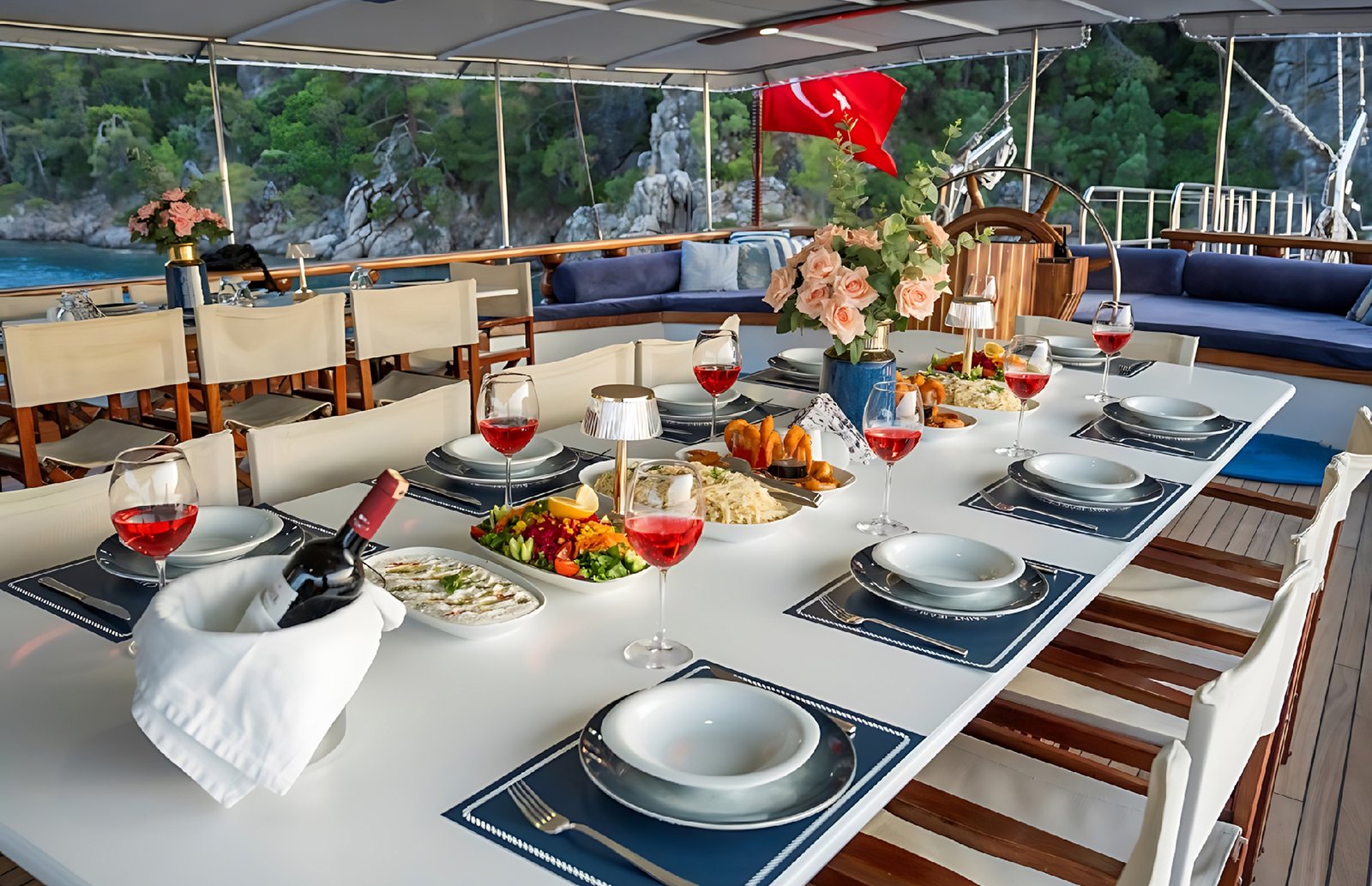 Seçenek 3 Siz hiç bir şeye karışmaz tatiliniz buyunca size tam pansiyon konaklama sunarız. Bu durumda Standart, Lüks ya da Delüks menülerimizden birini tercih ederek kişi başı günlük 35 ile 55 Euro arasında değişen bir bedel ödeyerek alkollü içecekler hariç herşey dahil tatilinizi yapabilirsiniz. Alkollü içeceklerinizi dilediğiniz şekilde temin edip tekneye getirebilirsiniz.