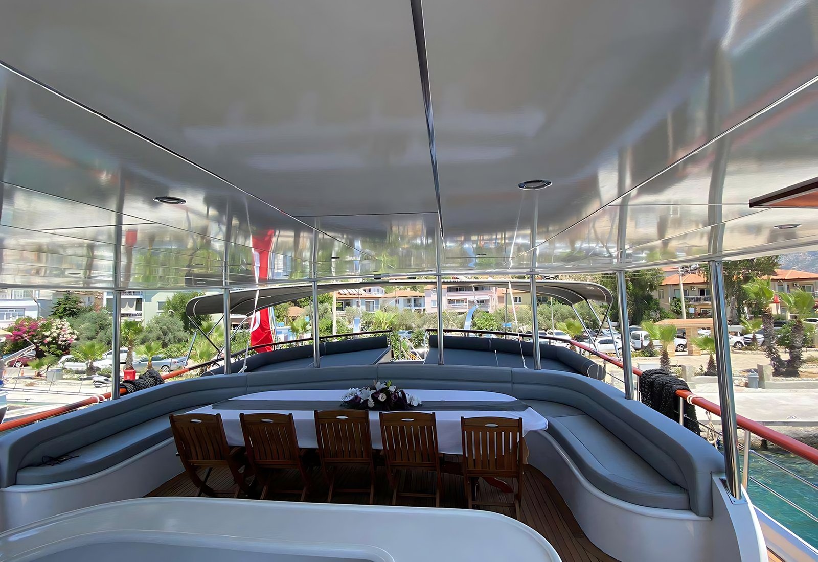 Yatımızın ön tarafında 12 kişi aynı anda güneşlenebilir ya da aksam gün batımda içkinizi veya saat 5 çayını içebileceğiniz konforlu ön oturma gurubunda dinlenebilir.