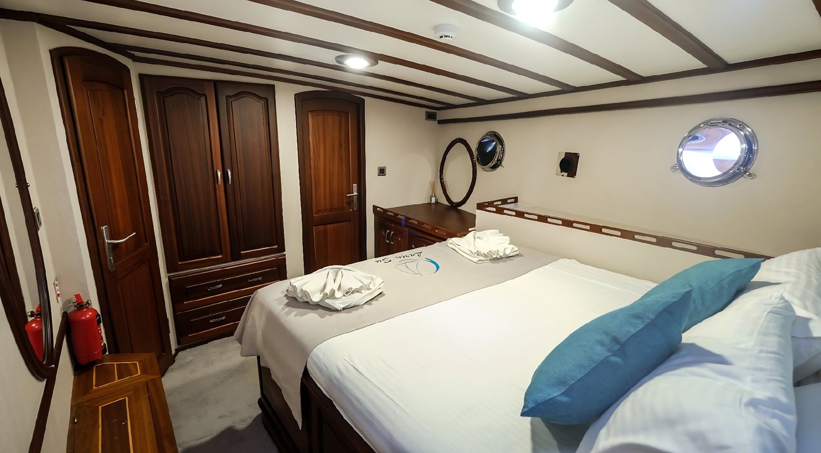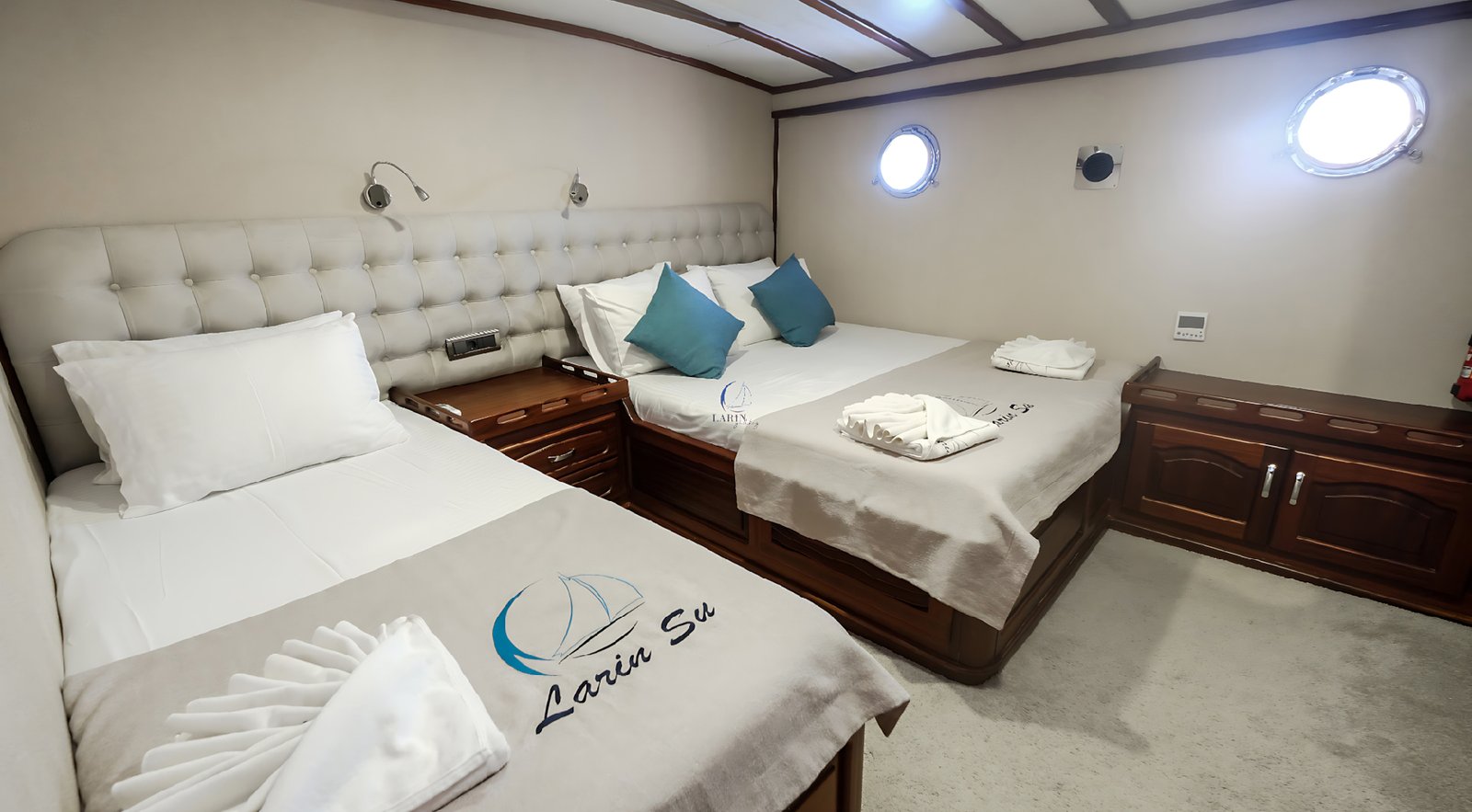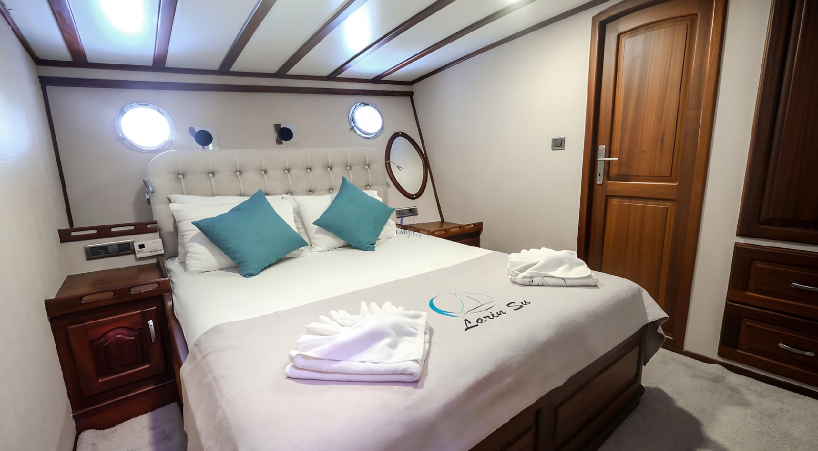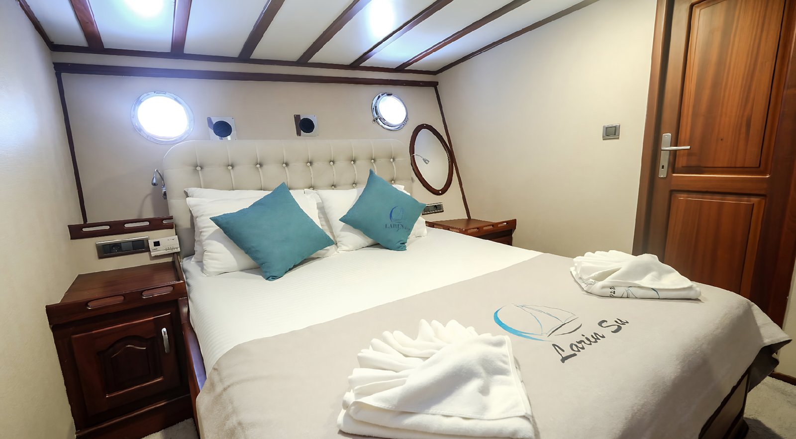 Teknemizde 5 Double kabin 3 Twin olmak üzere toplam 16 misafirin konaklayabileceği Vip yat'tır. Her kabinde son derece konforlu ve size özel duş ve wc imkanı sunmaktadır.
