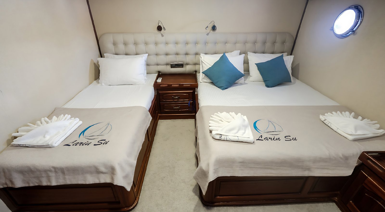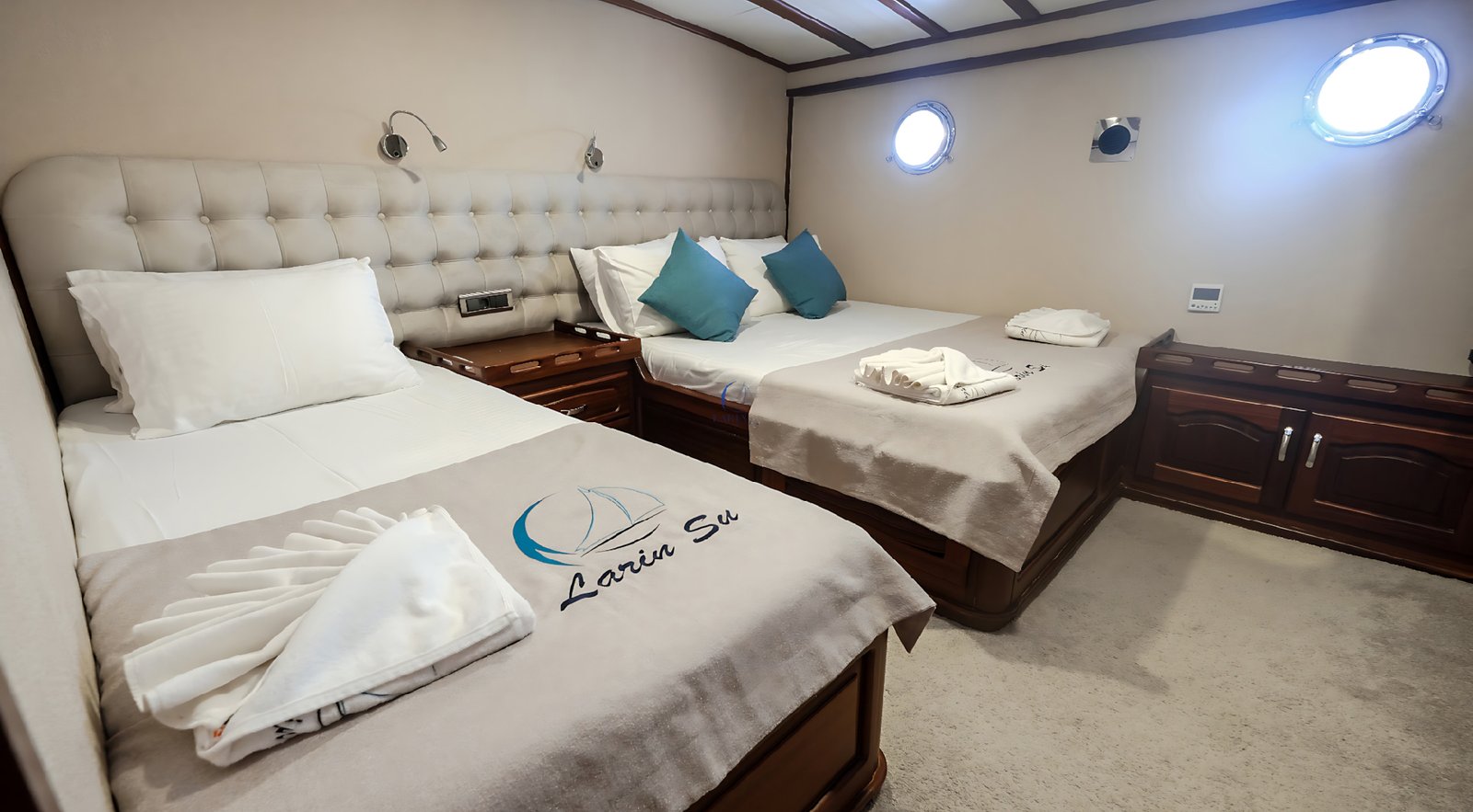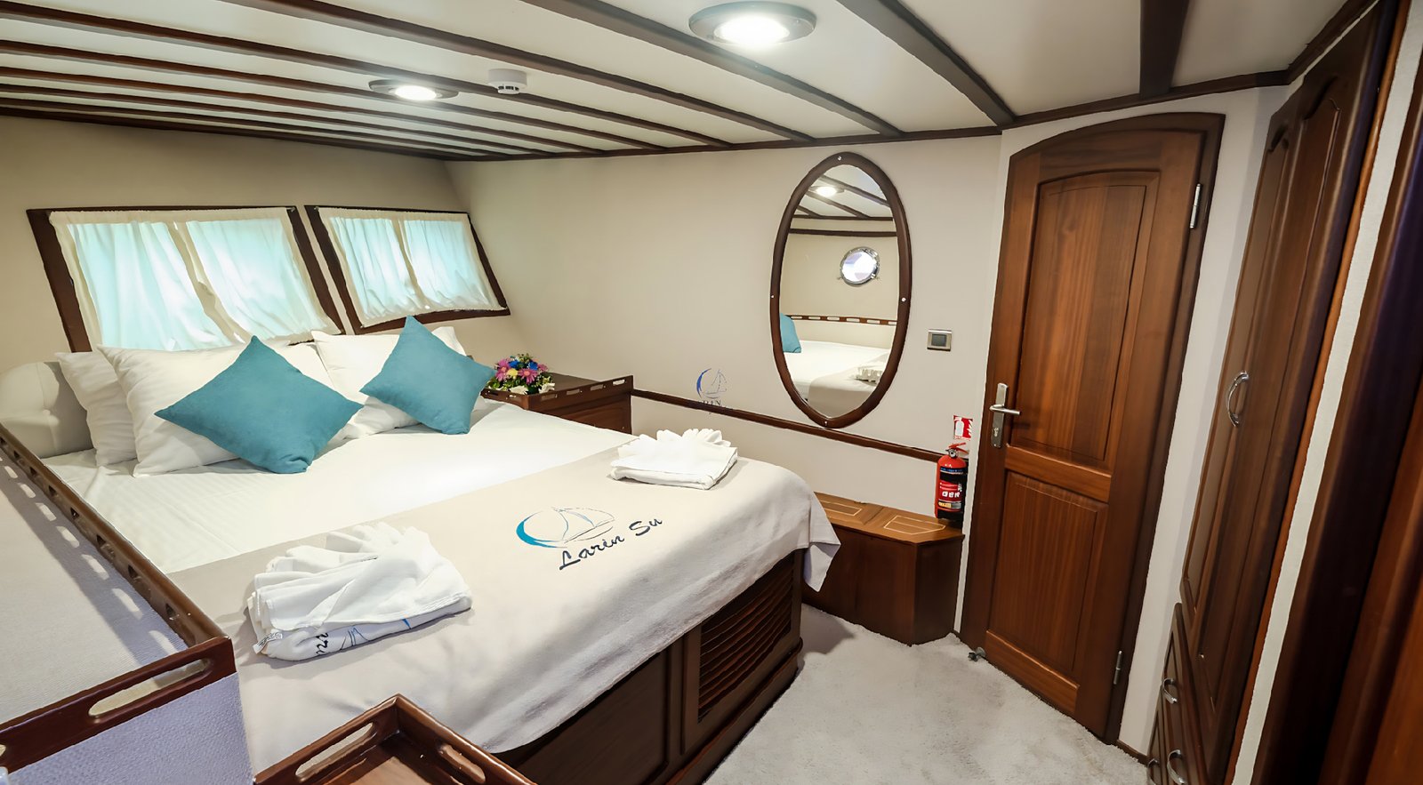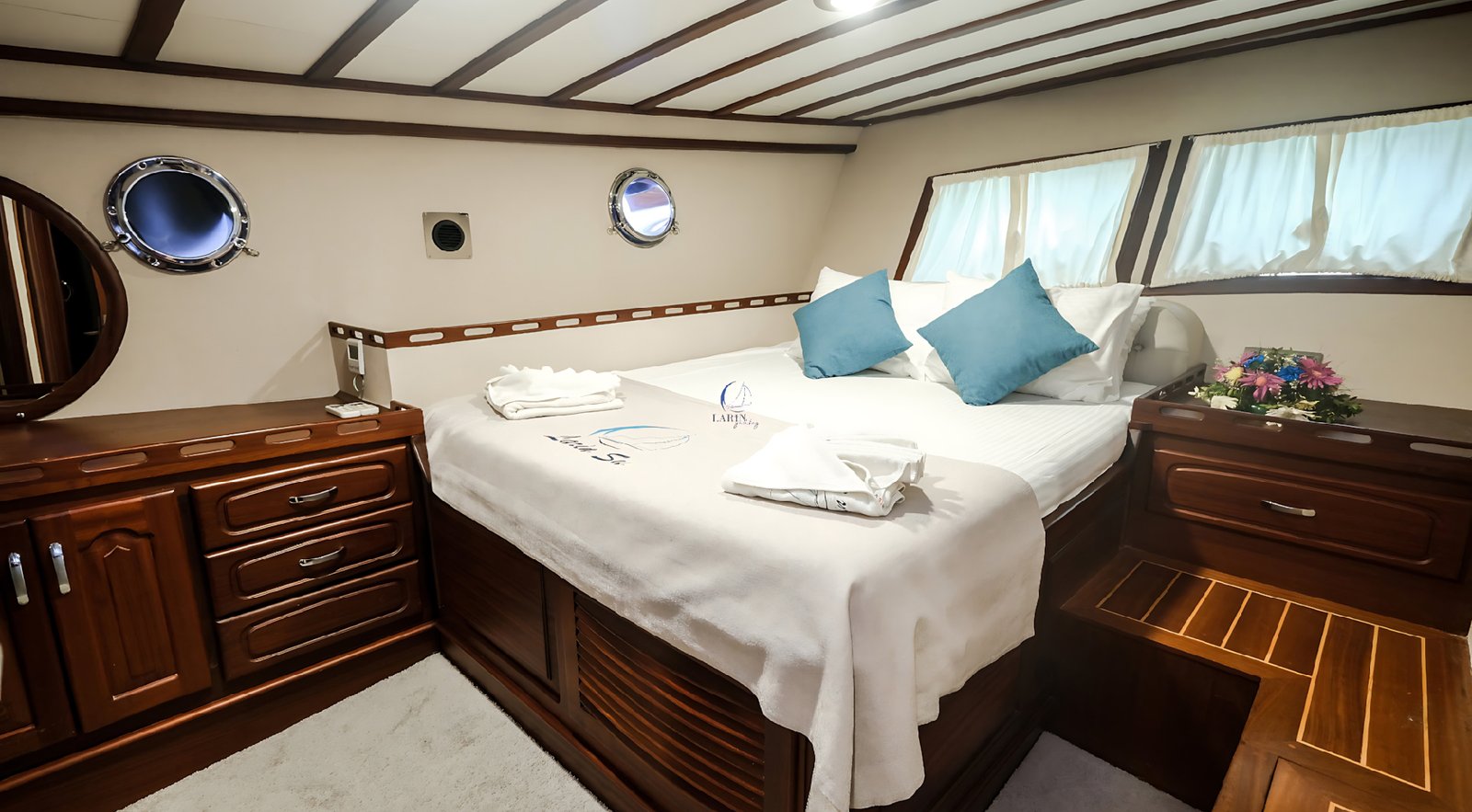 Teknemizde 5 Double kabin 3 Twin olmak üzere toplam 16 misafirin konaklayabileceği Vip yat'tır. Her kabinde son derece konforlu ve size özel duş ve wc imkanı sunmaktadır.